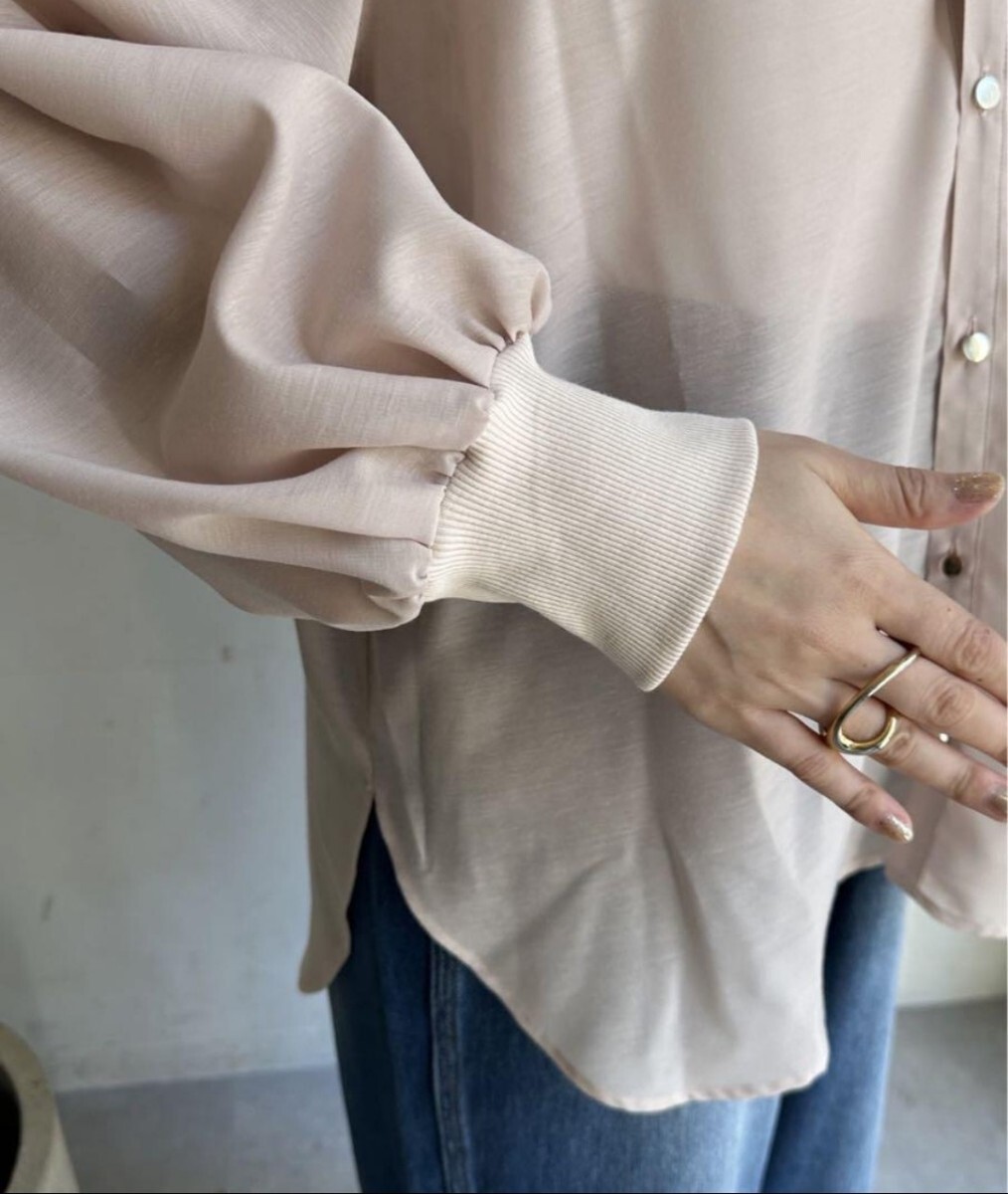 シアー感のある素材にゴールドボタンのあるレディライクなデザインに、袖リブでカジュアルな印象をプラス。