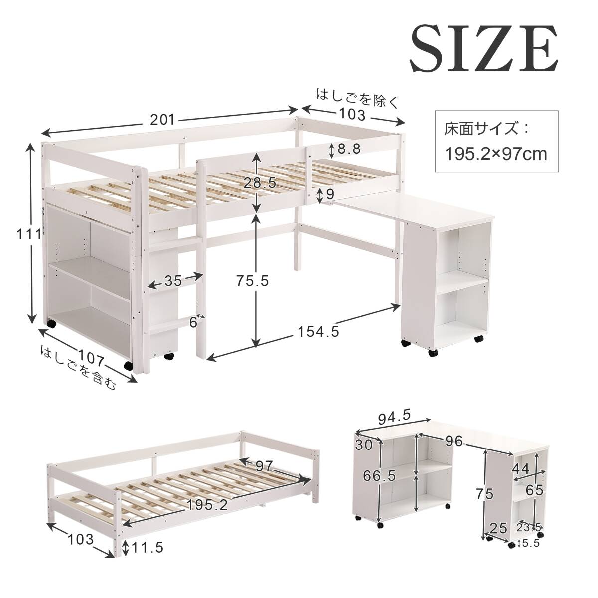 Product name: システムベッド ロフトベッド 木製 シングル ベッド ロータイプ ベッド デスク 本棚 机付き 学習机 コンパクト 本棚付き分離 分割 分割式