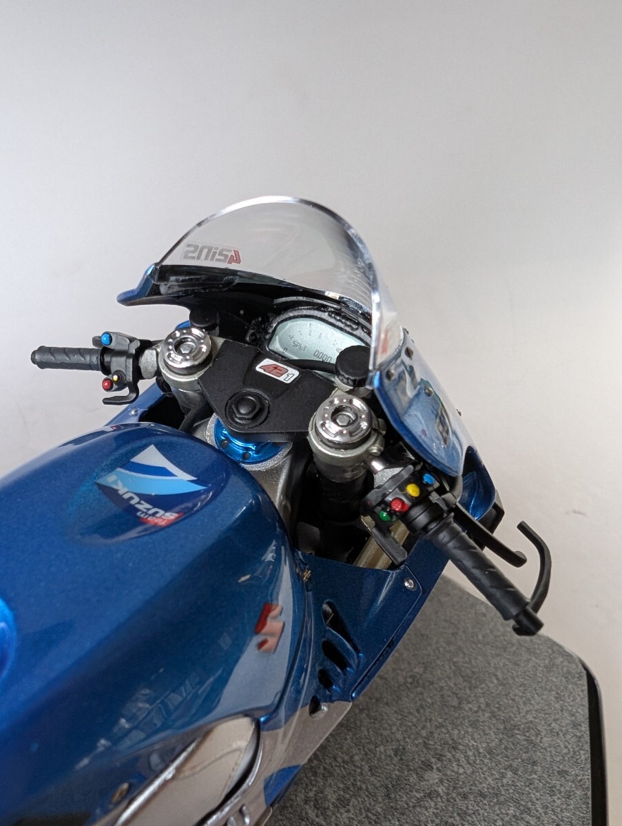 タミヤ模型さんのGSX-RR、アレックス リンス車です。車体はケースにゴム系接着剤で固定してありますが剥がせます。配送には気を付けますが部品取れなどありましたら自身で修理可能な方お願い致します。ノークレーム、ノーリターンでお願い致します。ケース付きです。