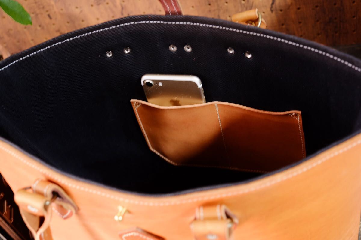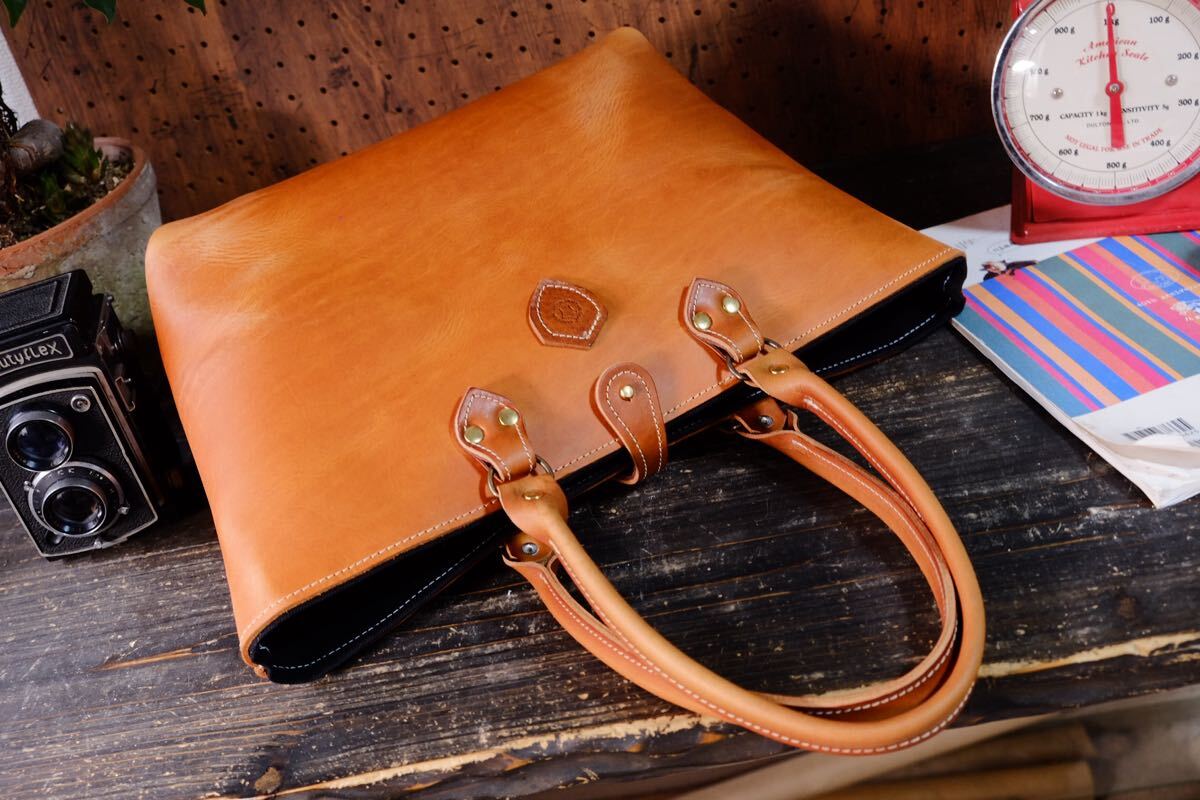 厳選したイタリアアニリン染めのプルアップブラウンバケッタヌメ牛革を中心に使用しクラシカルなデザインに仕立てました。 沢山のオイルを含んでおり大切にお使い頂く事で唯一無二の表情を見せてくれる経年変化を楽しめるレザーです。 裏地は丈夫な布でお創りしておりますので、耐久性とバッグとしての総合的な軽さを可能にしております丈夫な大変扱いやすいバッグです。