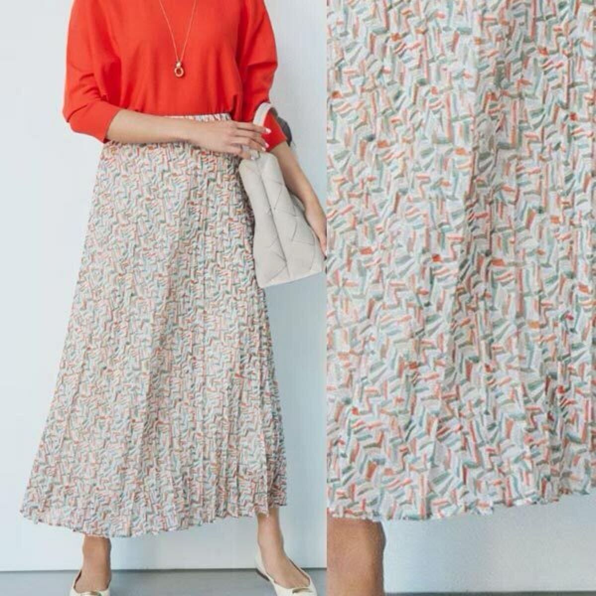 透け感のあるプリーツにグラフィカルなプリントで、華やぐプリントスカート
