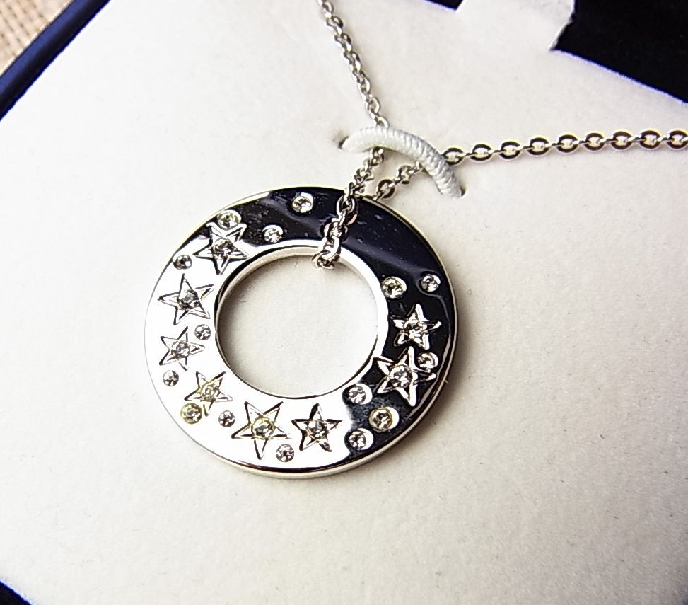 ◆円形のペンダントトップに、星のモチーフとクリスタルが散りばめられたデザインです。両面同じデザインです。TOP取り外し可能 /クリスタルの輝きがきれいです チェーンはシルバーカラーのシンプルなタイプです。