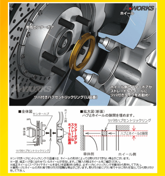 ★純正以外のアルミホイールを装着すると、ホイールとハブの間に隙間ができてしまい、高速走行時のブレの原因となりますが、このハブリングを装着すれば防止効果が得られます。