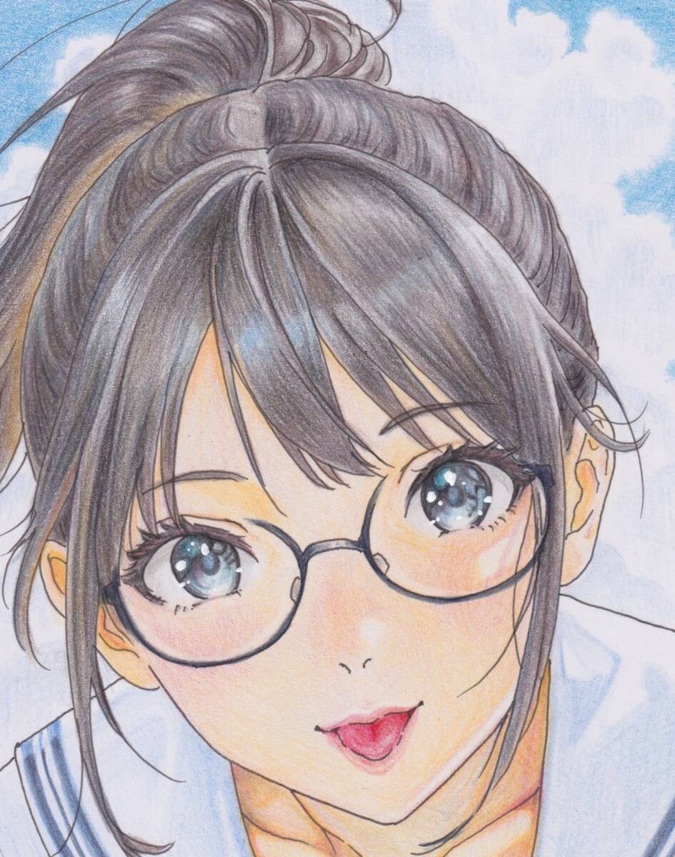 Product name: 【1点もの】 オリジナルキャラ 真夏の黒髪 ポニーテール メガネ 美少女 手描き アートポスター イラスト 原画 色鉛筆 B5サイズ 手書き