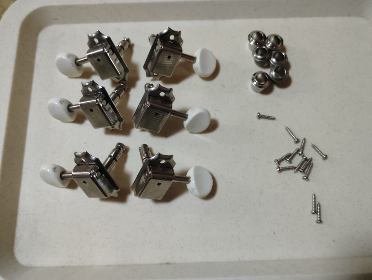 クルーソンタイプの3:3ペグ、ホワイトボタンです。知人からの貰い物ですが、ギター製作断念のため出品します。他にもギター部品を出品しますので、ぜひご覧ください。