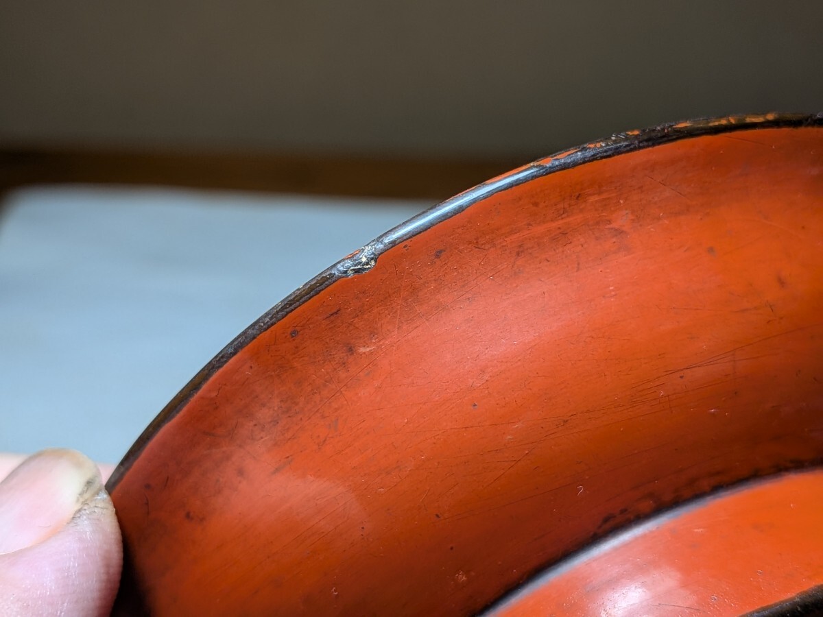根来の盃5客です。柔らかな朱の色と刷毛痕、微細な断紋、経年の味わいと古格充分です。三つ碗や四つ碗の小ではなくこの形単体で作られた物です。1客の縁に3ミリ程の浅い漆の剥け、他の1客の縁にノミホツが1か所ありますが全体的に大変良い状態です。盃として小向付けとして豊かさを演出してくれる味の良い根来盃5客を特別出品です。・口径10.5〜10.7センチ・高さ3.5〜2.7センチ・桃山〜江戸前期 ※今週は連休のため金曜出品日曜終了と土曜出品月曜終了と2回に分けての出品です※新規の方、評価の悪い方の入札は取り消す場合があります。商品到着後は速やかに取引ナビの受取連絡を入れて下さい。