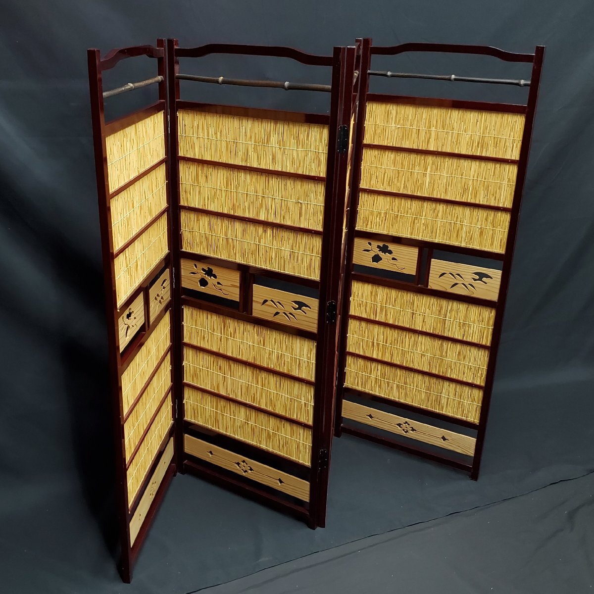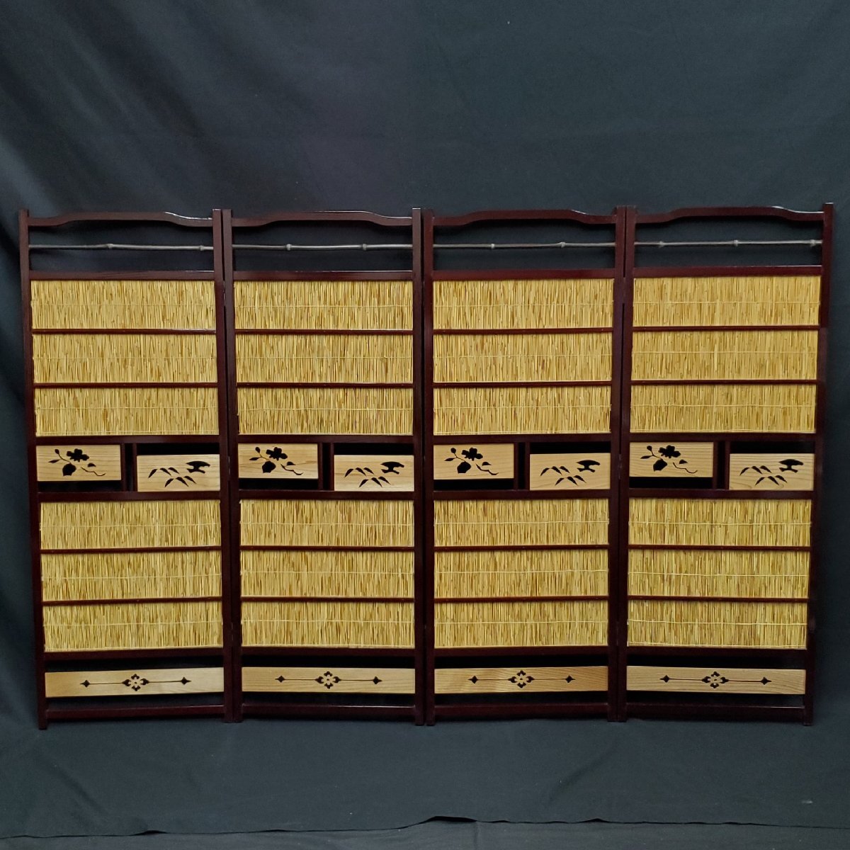 【宝蔵】木彫透かし飾り 御簾屏風 夏屏風 折りたたみ 4連衝立 間仕切り 高さ約120.5cm 和室インテリア