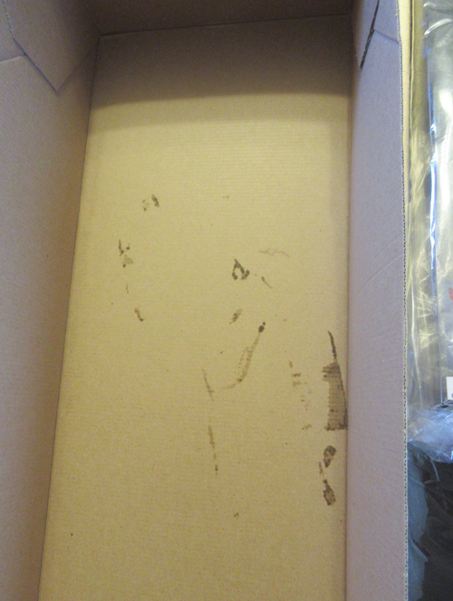 傷みがあります。フタの裏に合皮の色移りによる黒い汚れがあります。