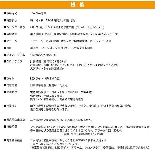●その他機能:電波受信機能 (日本標準電波・福島局/九州局)、時報 (毎正時・オン/オフ切替機能付き)、デュアルタイム、クロノグラフ (スプリットタイム機能付)、LEDライト (デジタル部)、節電機能、過充電防止機能、充電警告機能、フル充電時持続時間 (30ヶ月)