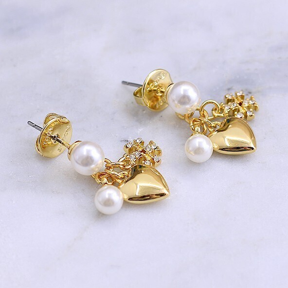 トリーバーチのロゴ、ゴールドのハート、1粒パールのチャームをドロップさせたピアスです♪