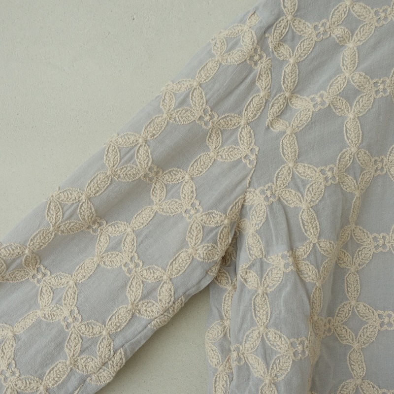 mina perhonenのhanaha 刺しゅうブラウスです。カラーはライトグレー(表記カラー:light blue)で、透け感のある薄手生地にhanahaのテキスタイル刺しゅうがあしらわれています。ボタン開閉で、定価(メーカー希望小売価格) 57,200円の商品です。