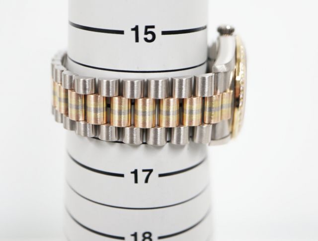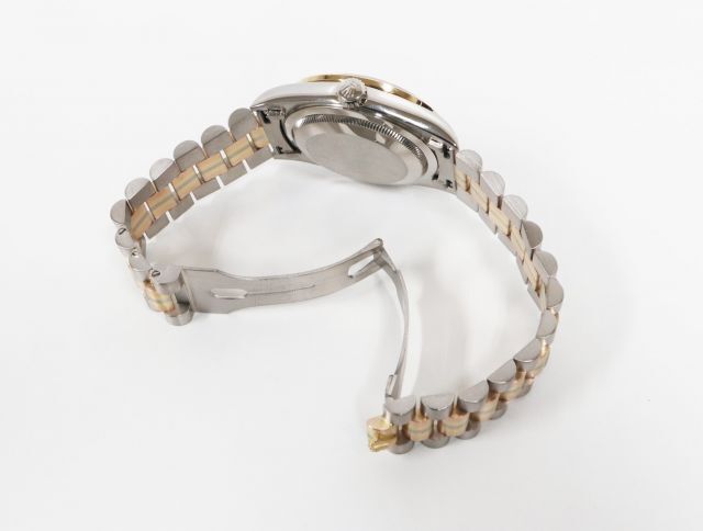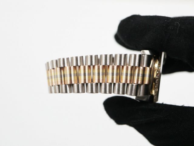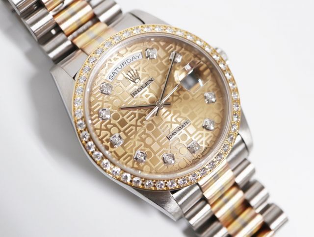 ロレックスの最上級ラインとして1956年に誕生したハイクラスシリーズ“デイデイト”。高級素材のみを使用しているモデルであり“富と成功の証”とも言われています。こちらは、イエロー・ピンク・ホワイトの3色のゴールドを使用した“トリドールブレスレット”を備えたモデルです。現在は製造されておらず、希少価値も高まっています。
