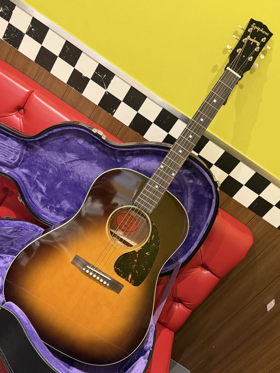 GibsonのJ 45オールドモデルを探していたところ、奥田民生モデルがエピフォンから限定発売?されたと聞き、思わずポチりました。3週間ほど待ってから到着、思わず興奮わ抑えながらチューニングをして6弦から1弦へダウンピッキングしたときの感動は今も新鮮です。