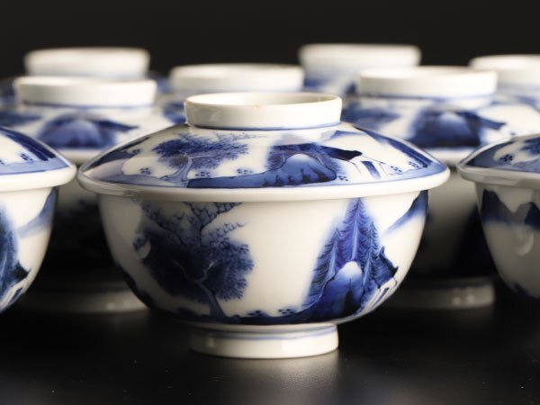 【流】平戸嘉祥 上手染付 蒸茶碗二十客 共箱 DK239