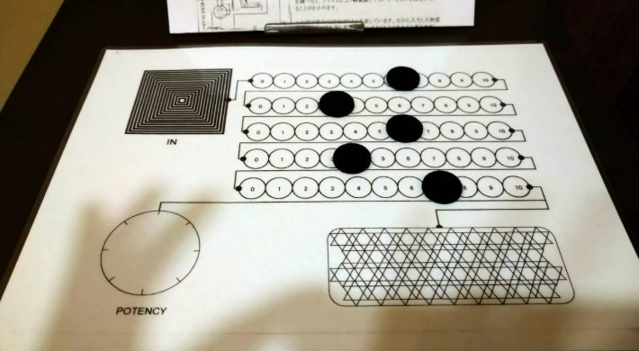 ご自身の治療を行ったのち、「今日の状態を保持するRATEは?」と念じながら、システムパッドを擦ります。そのRATEが示す数値を●を5段置き、INの上に載った名前が書かれた用紙が動かないように、治療院内のどこかに保管してください。保管の日にちまで設定したい場合は、「保管の日にちは?」と念じながら、1から数えて指の動きが弱まる数値の日にち分だけ保管してください。