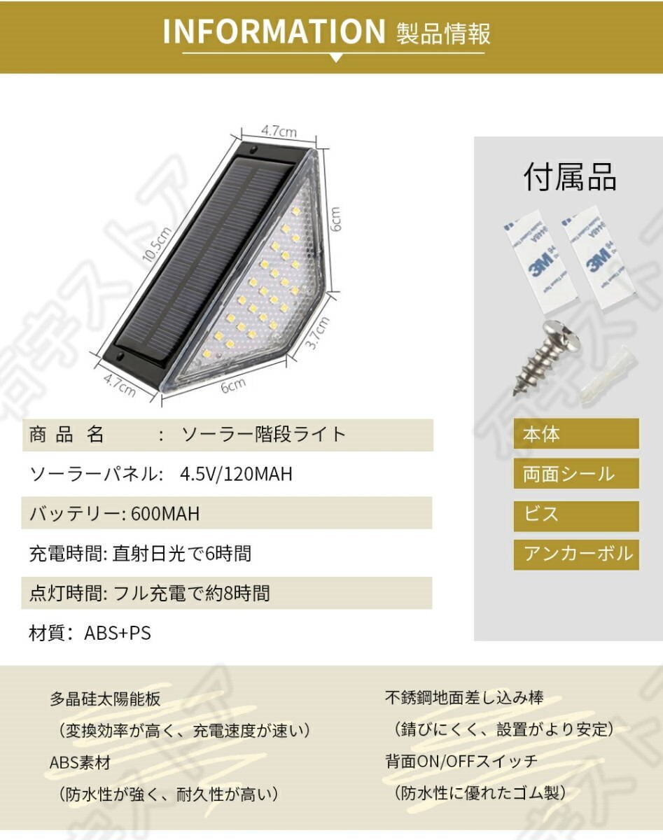ソーラー部分にセンサーが内蔵されており、夜間は自動でON状態になります。