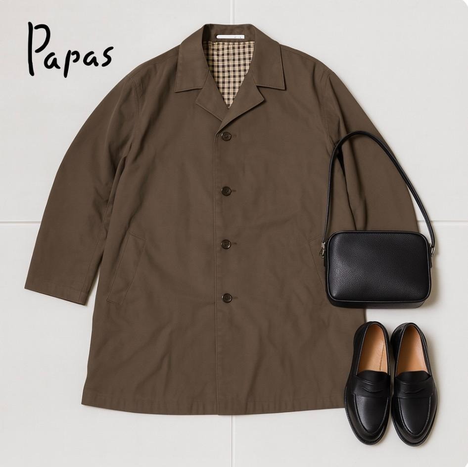 #J1327 @ Papas チェック裏地ステンカラーコート S カーキ