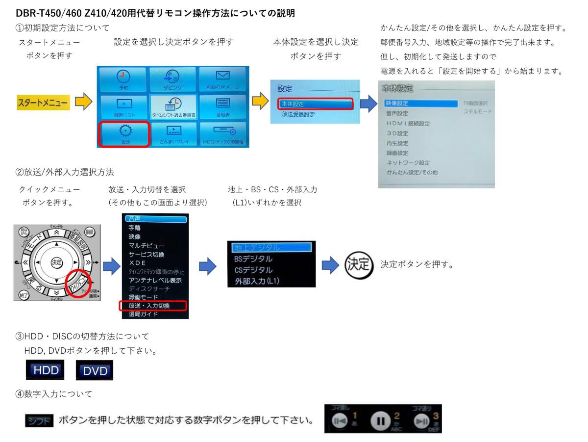 リモコン操作方法についてDBR-T450/460付属の物とは異なります。写真10の操作方法を参照して下さい。