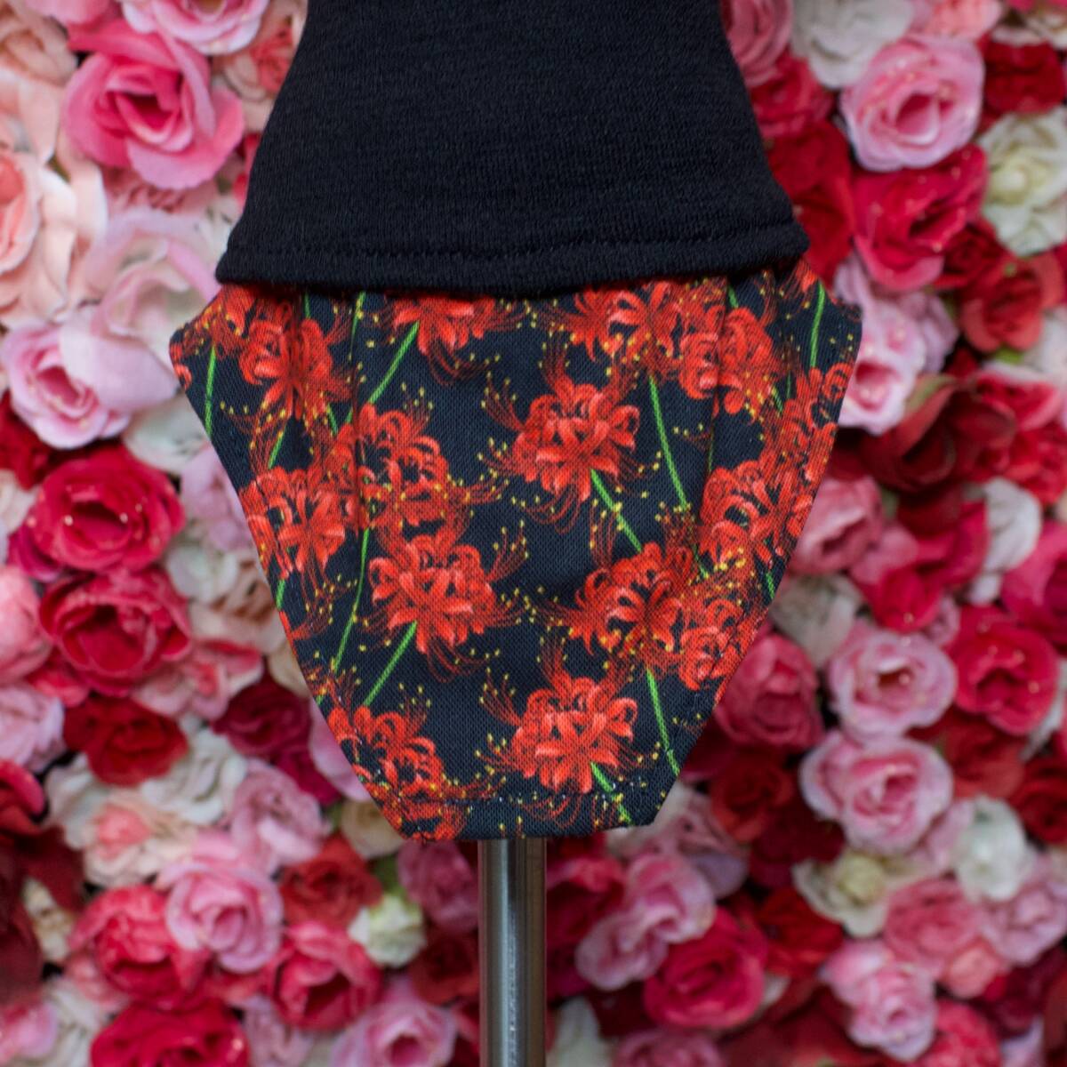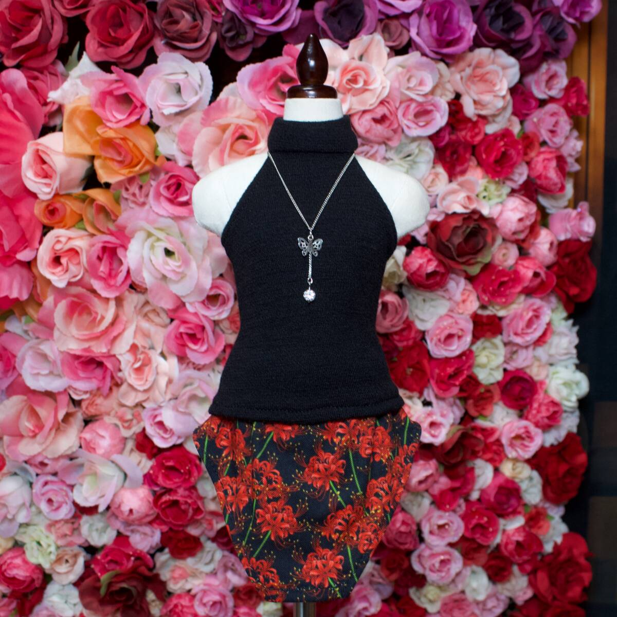 ブラックニットトップス、彼岸花レッド変形スカート、ネックレスの3点セットです。1から型紙をお作りしましたハンドメイド作品になります。