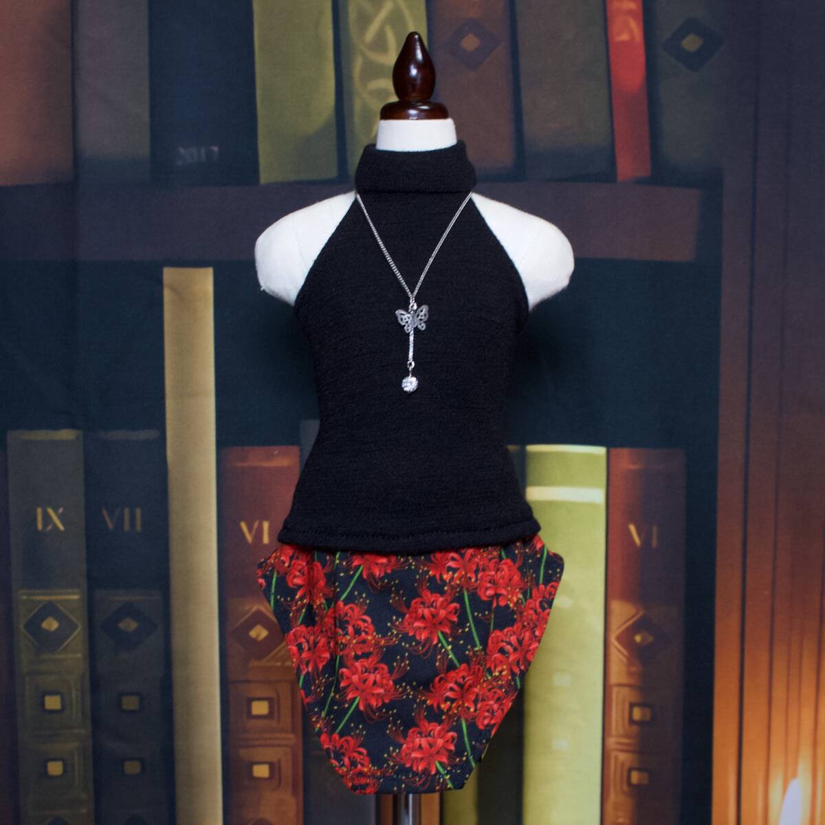 40cmドール MDD ( L胸 もちあし OK ) SDM MSD 対応 * ブラック ニット トップス & 彼岸花 レッド 変形 スカート & ネックレス * 服 衣装