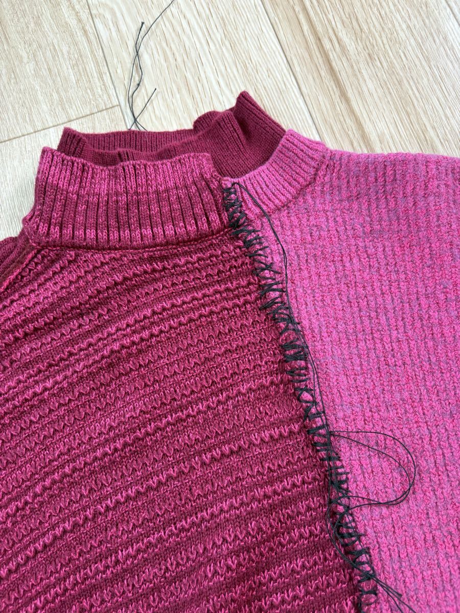 ウールやコットンなど数種類の糸で複数の編地を作り、つなぎ合わせたプルオーバーニット。
