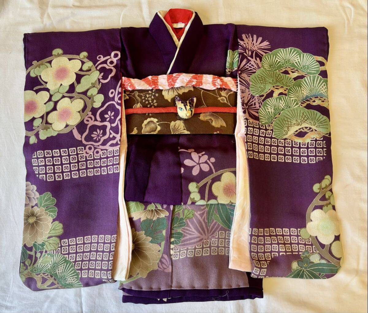 Product name: 人形の着物(15号相当) アンティーク絹 縮緬 茄子紺色地、松、竹、梅、刺繍 半襦袢/帯/帯揚げ/帯締め/猫の帯留め付き 送料無料