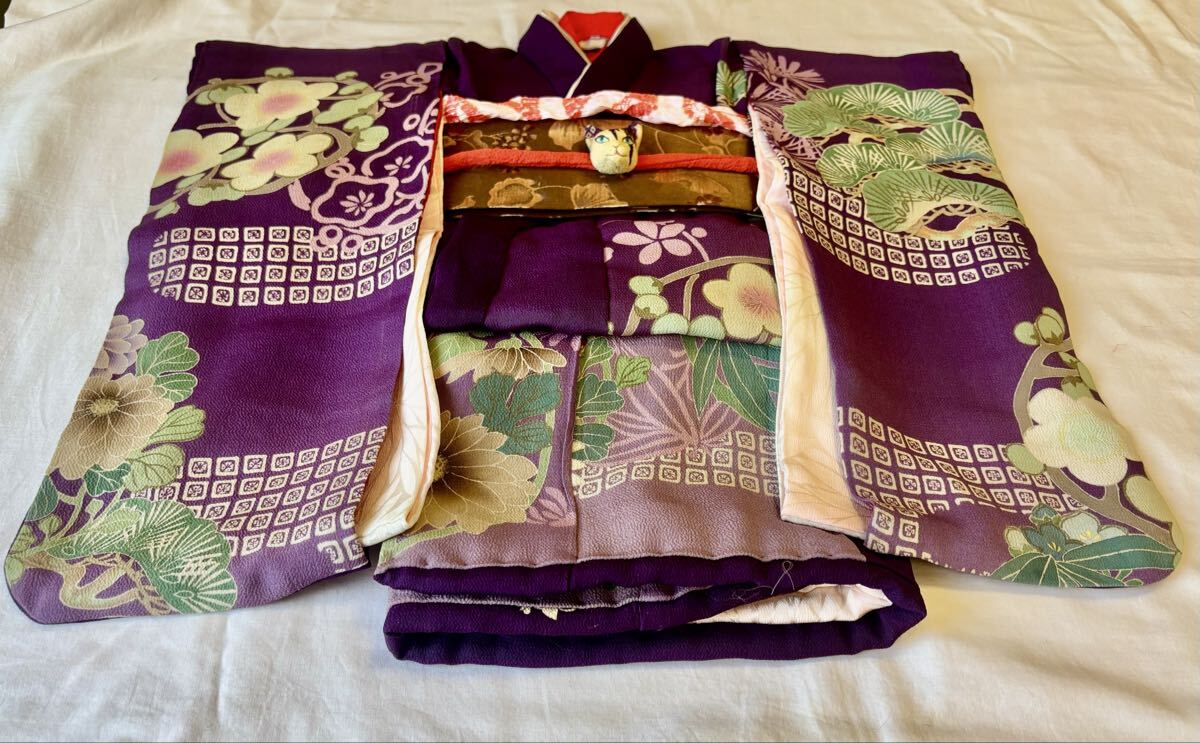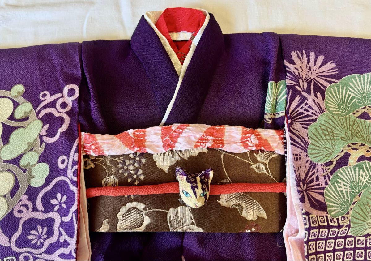 裏と袖口は表地と同じ縮緬裾と袖部分は薄桃色の綸子の襦袢が付いています。帯紐、伊達衿、半衿もついています。別途、帯、帯揚げ、帯締め、猫の縮緬張りの帯留めがセットになっています(画像でご確認ください)。