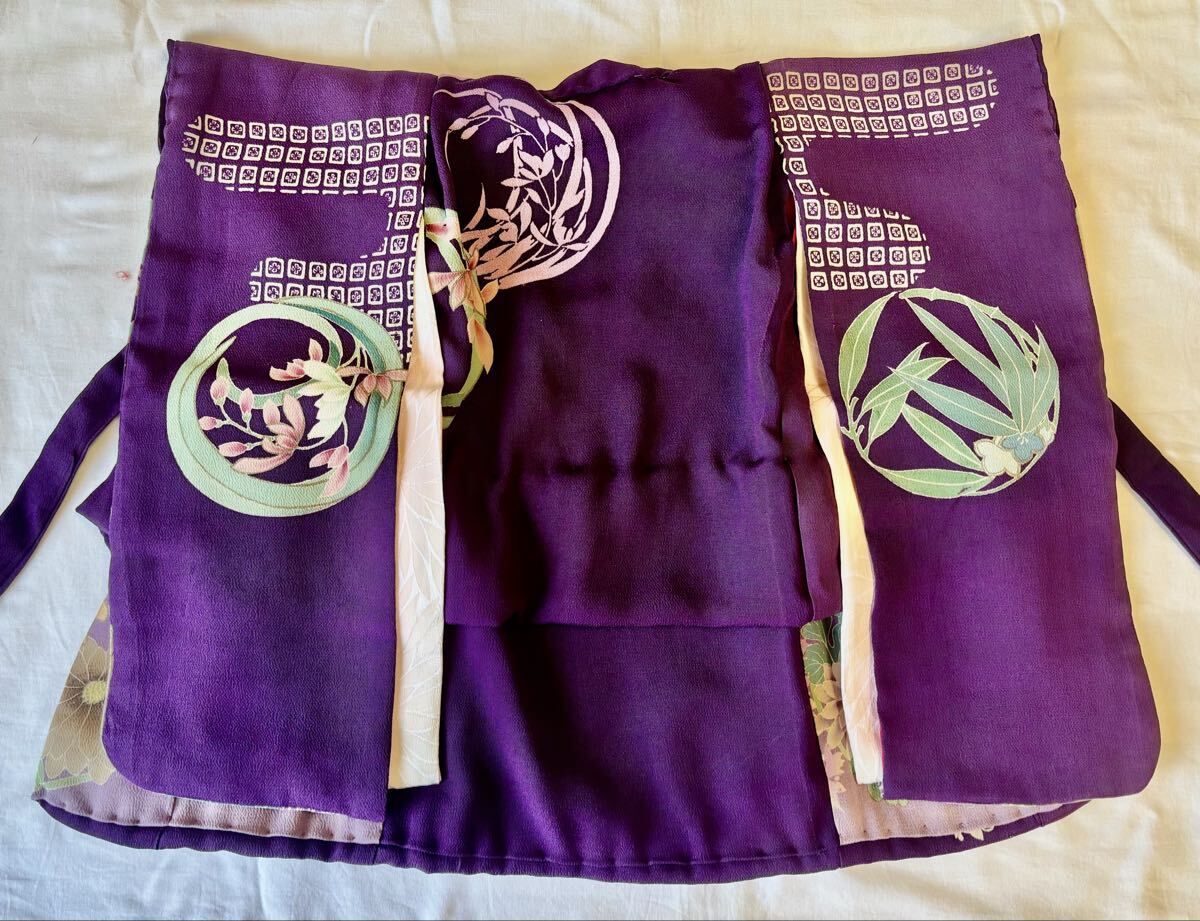 地色は落ち着いた茄子紺色(深い紫色)で、松竹梅のおめでたい柄の着物です。少し刺繍が入っています。生地は縮緬で、しぼは細かめ、生地は柔らかくしなやか、厚みは普通です。折り跡や小さい傷、染ムラなど、アンティークの古さがそれなりにありますが、状態は大変良いです
