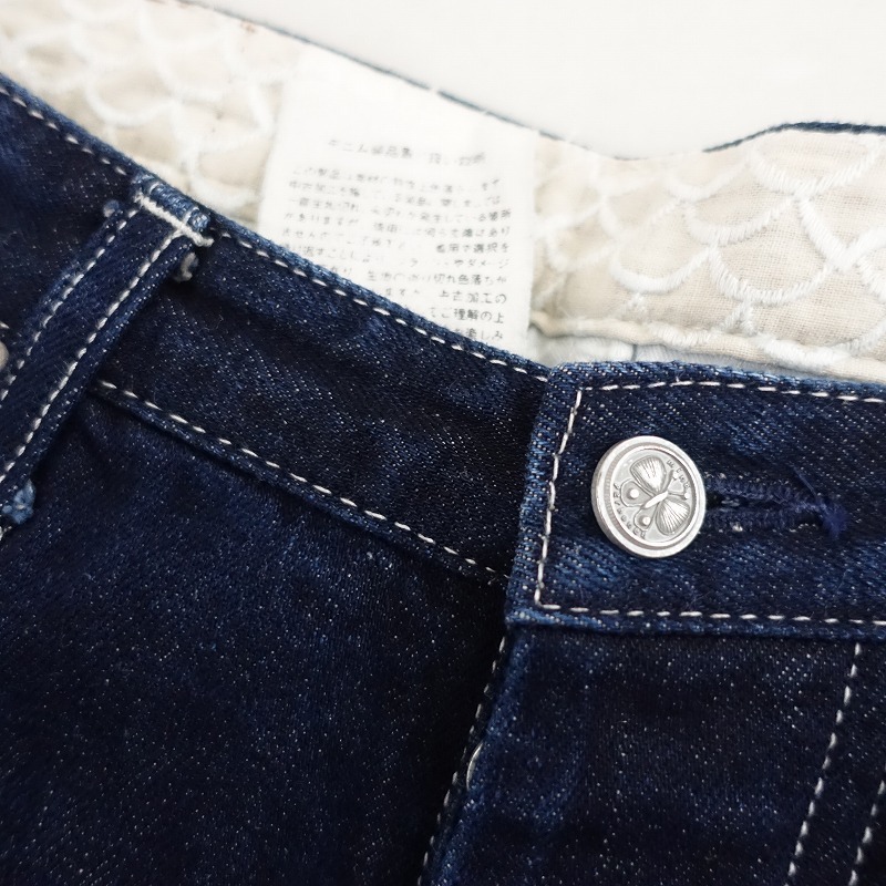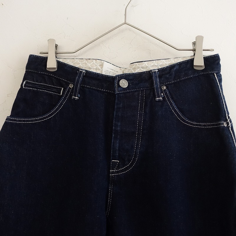 mina perhonenのalways コットンリネンデニムパンツです。カラーはインディゴネイビーで、セルビッチデニム素材です。フロントボタン開閉式で、ウエスト&ヒップの左右両サイドにポケットとフロント右ウエストトップにコインポケットがございます。バック右腰に刺しゅう入りレザーパッチがあしらわれており、ウエストの裏地とポケット内袋の一部に「mermaid」のテキスタイル刺しゅうが施されております。