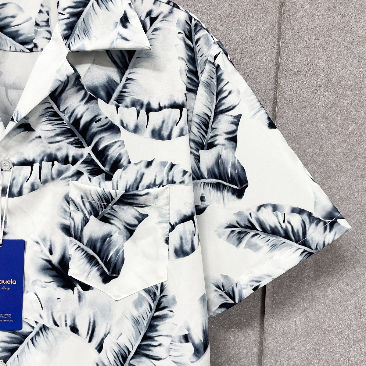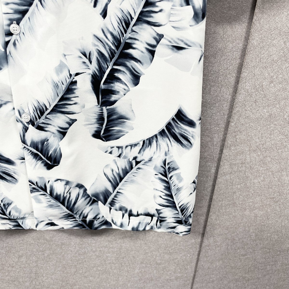 繊細なリーフ柄模様のデザインが上質なため、意外と派手過ぎず上品に着こなせます。トレンドの開襟デザインの胸元で、ラフで抜け感のある雰囲気を演出します。ボタンを留めて綺麗に着こなしても良し、少し開けてレイヤードのアクセントとしても良し。胸元のポケットが現代的なリラックス感を演出し、どんなシーンでもナチュラルに着こなせます。