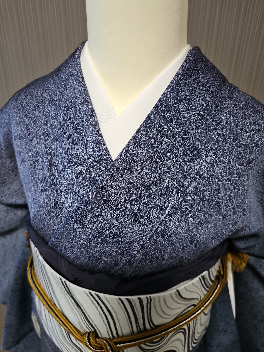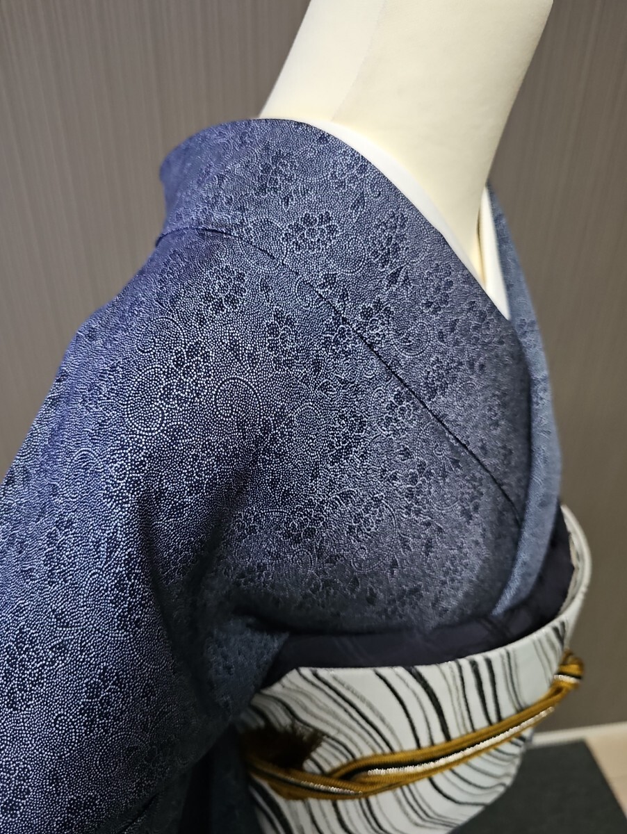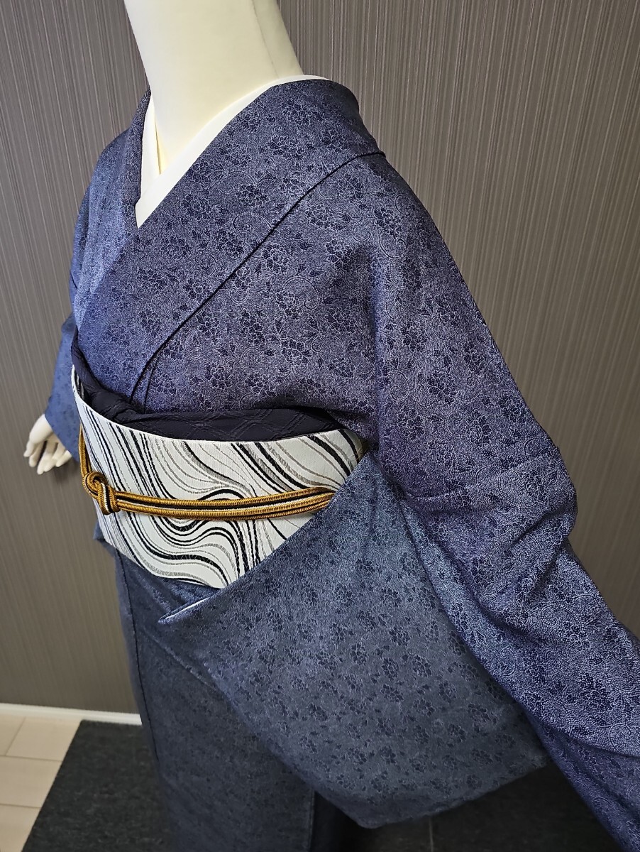 ★滑かな艶の有る上質縮緬生地、藍系、型染めによる花唐草文様がシックなモダンさを表現する上等なお召し物でございます。