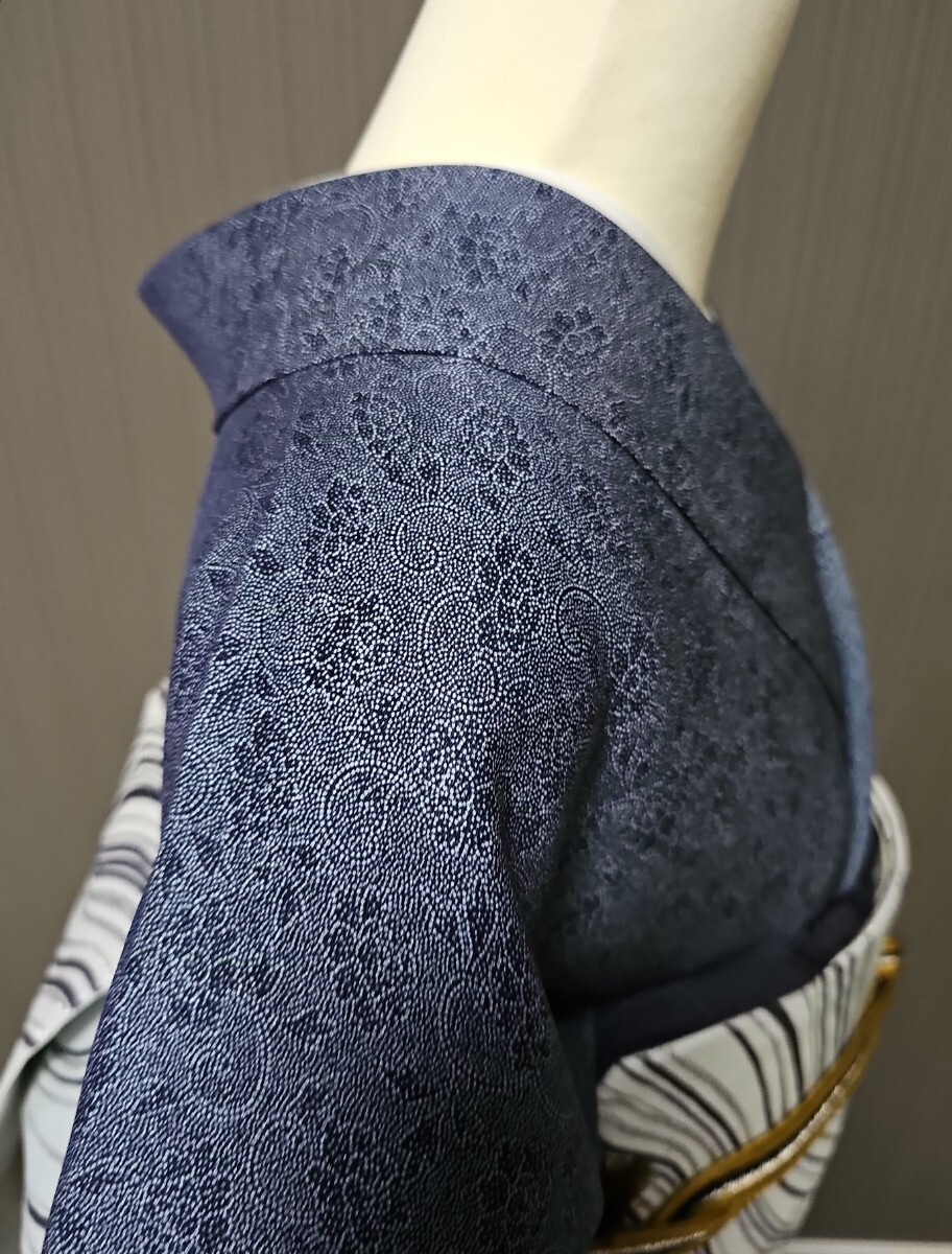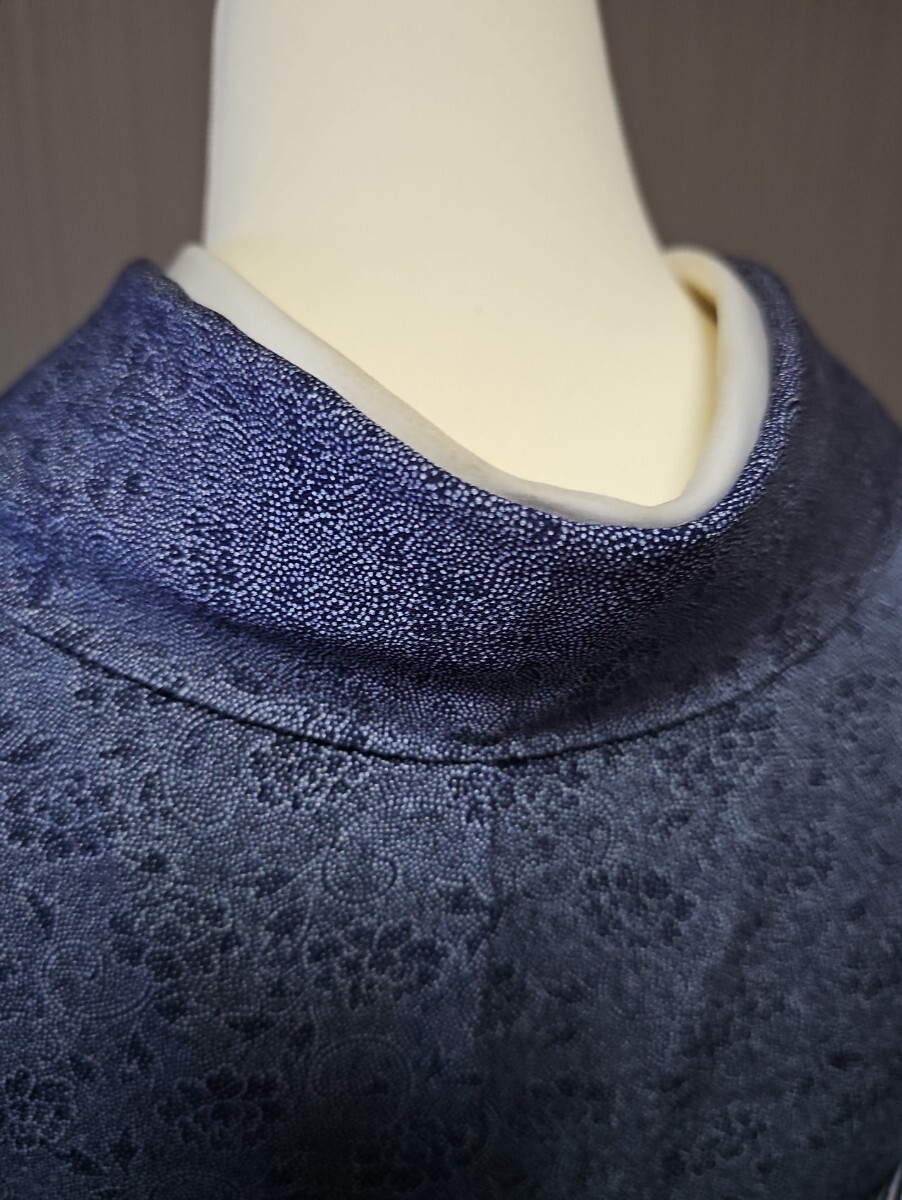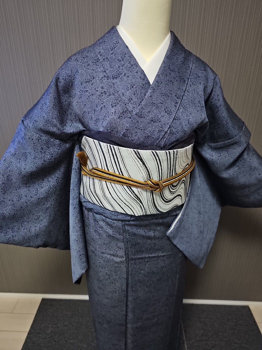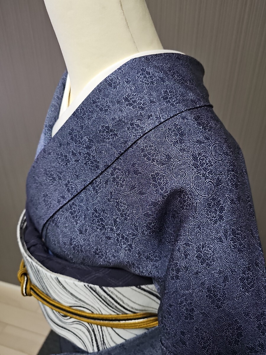 ★滑かな艶の有る上質縮緬生地、藍系、型染めによる花唐草文様がシックなモダンさを表現する上等なお召し物でございます。