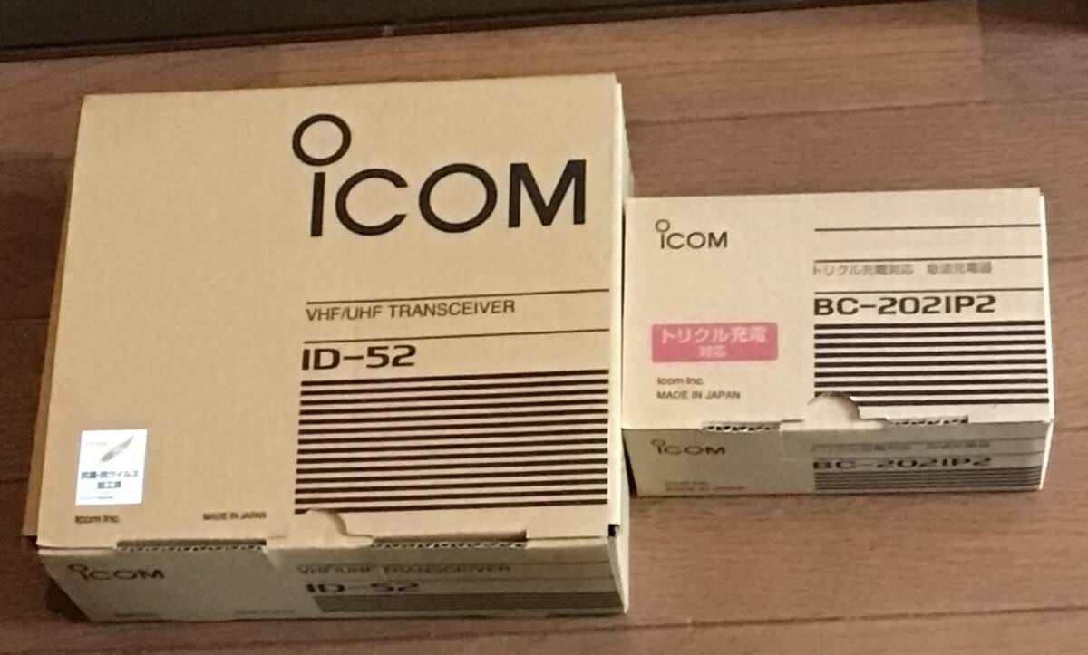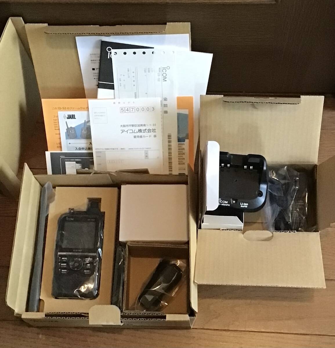 多彩な機能を携えて、D-STARトランシーバーは鮮やかに、新世代へ。ID-52  PLUSの方ではありませんので、格安です。昨日はほぼ同じです。購入時の付属品は、みな揃っています。保証書は無記名です。専用充電器のセットとともに購入すると、割引が効いても¥65,000円くらいします。取説も見ていないので、折り目もありません。