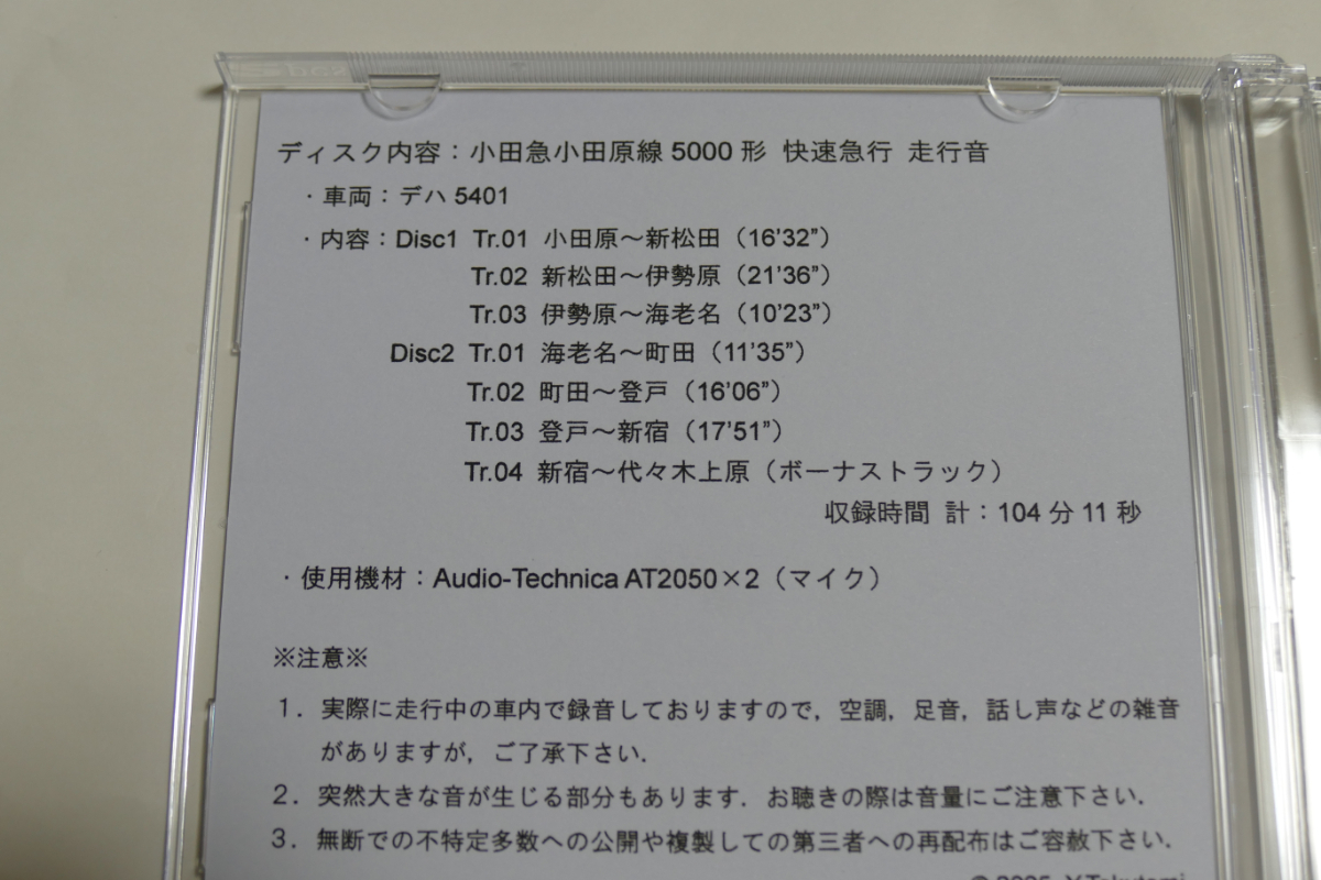 Product name: 【自作CD】《2025年新作》小田急5000形 小田原線快速急行 走行音CD 小田原→新宿《2枚組》 ①