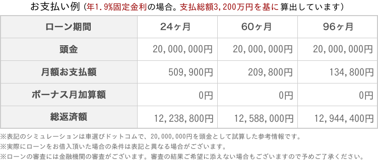 シミュレーションの計算は、オークションの開始価格と参考諸経費を合算した金額を基に算出しています。実際の購入元金とは異なる場合がございますので、予めご了承ください。