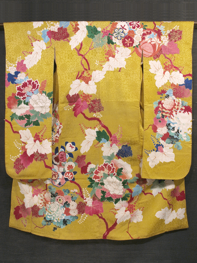 詳細 沈んだ芥子(からし)色の地に笹や唐草の地紋が織り出され、蔦や牡丹、菊などの文様が染められた、綸子の振袖です。袷仕立てで、染め抜きで「丸に六つ鷹の羽車」の五つ紋が付いています。文様のところどころに金駒刺繍が施され、上前身ごろの裾模様の一部には刺繍が施されています。