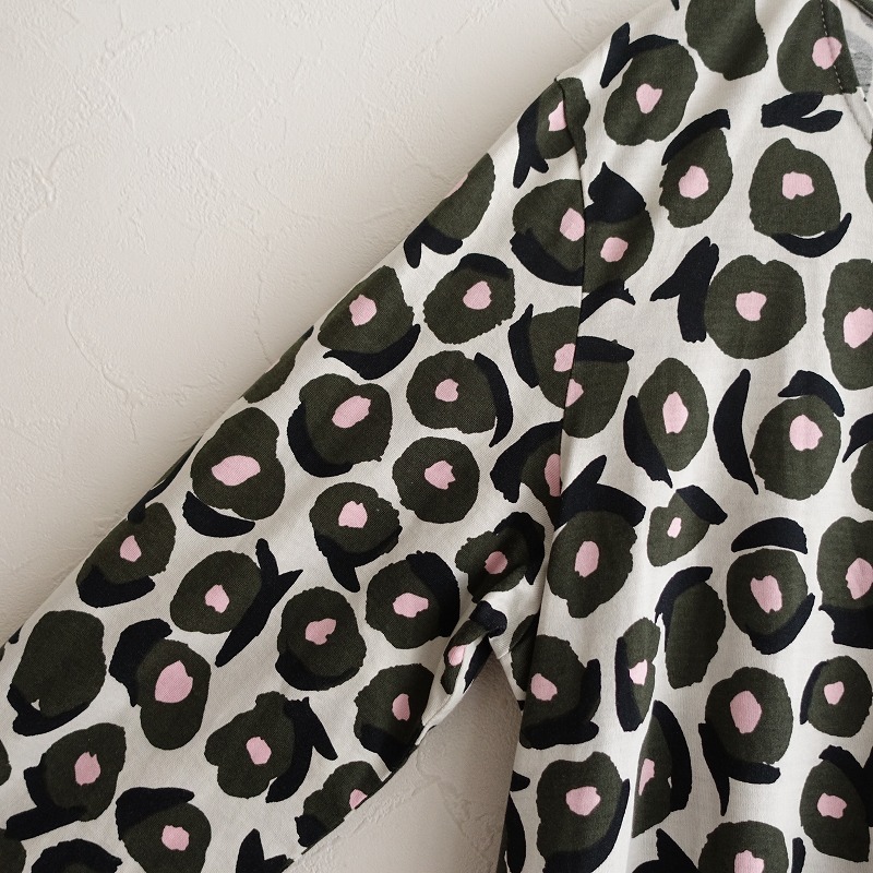 marimekkoのプリントワンピースです。カラーはライトミント・ダークグリーン・ピンク・ブラックで、総柄で薄手のカットソー素材です。プルオーバータイプのAラインシルエットで、左右ウエストにシームポケットがございます。