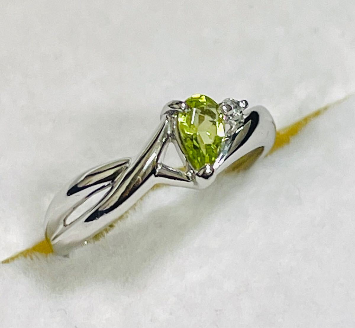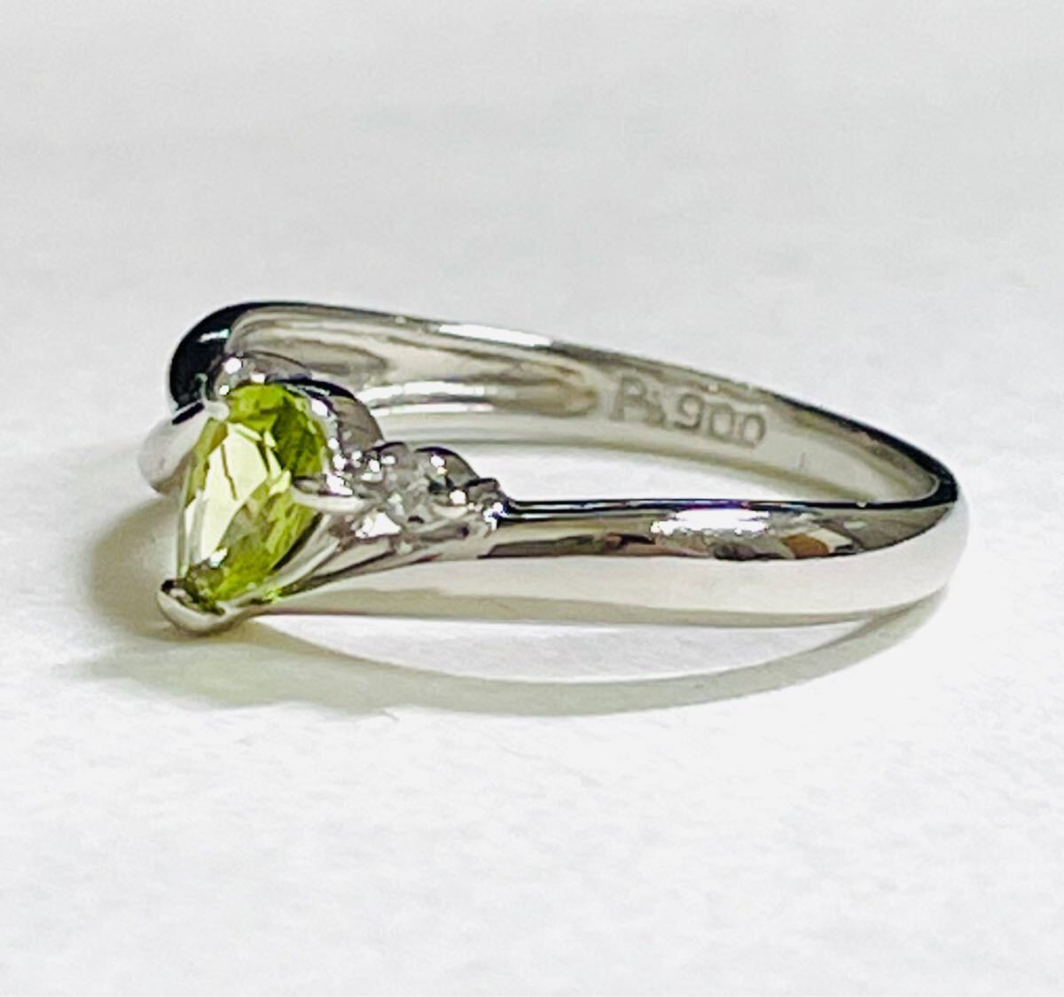 こちらは、Pt900台にペアシェイプドカットのペリドット1石とダイヤ1石付きリングです。
