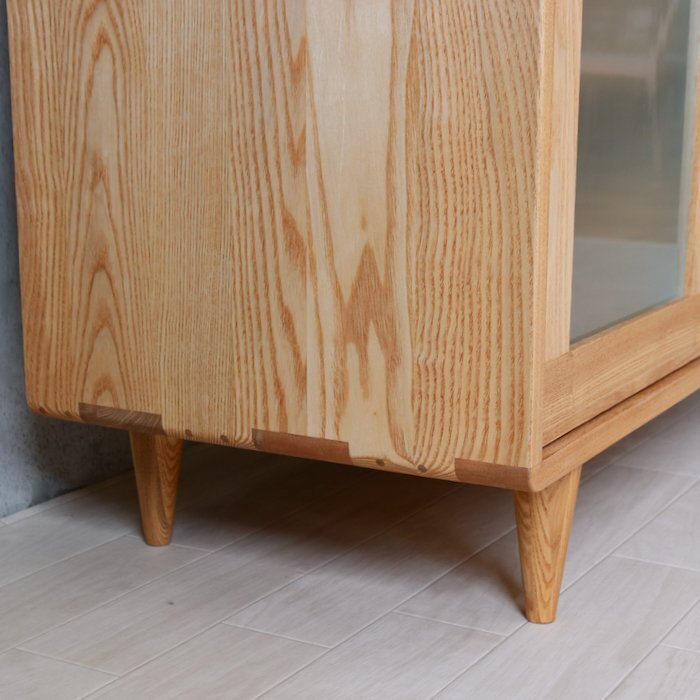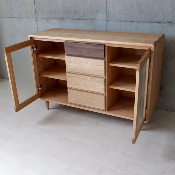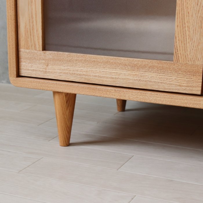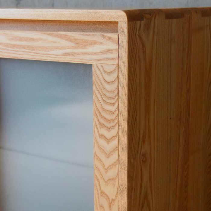 本体はタモ無垢材仕様、ガラスは内部がわかりにくいミストペンガラス。幅90サイズもあります。