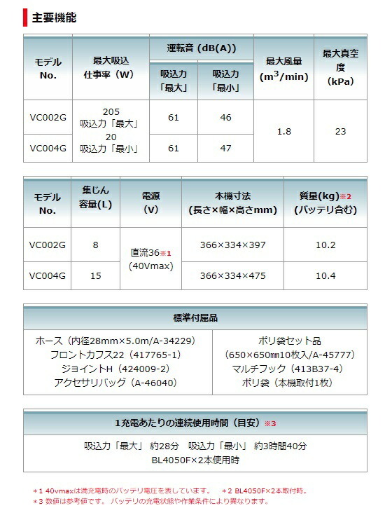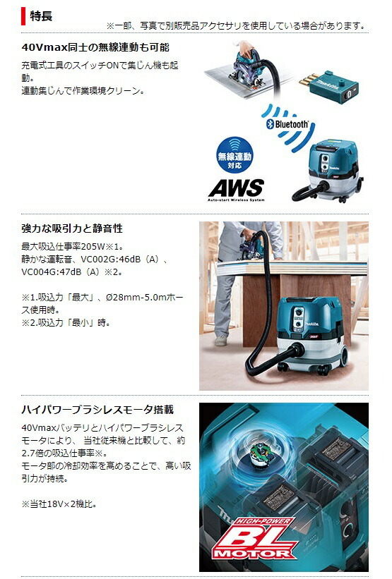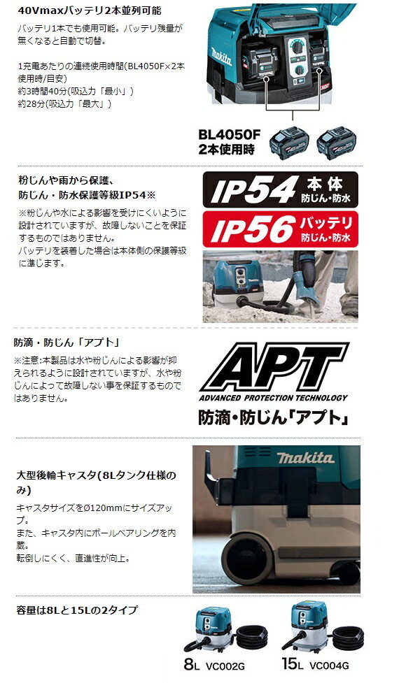 マキタ makita充電式集じん機VC002GZ本体のみです。※バッテリ・充電器は別販売品です。88381753265■40Vmax同士の無線連動も可能充電式工具のスイッチONで集じん機も起動。連動集じんで作業環境クリーン。■強力な吸引力と静音性最大吸込仕事率205W※1。静かな運転音、VC002G:46dB(A)、VC004G:47dB(A)※2。※1.吸込力「最大」、?28mm-5.0mホース使用時。※2.吸込力「最小」時。■ハイパワーブラシレスモータ搭載■40Vmaxバッテリ2本並列可能■粉じんや雨から保護、防じん・防水保護等級IP54※※粉じんや水による影響を受けにくいように設計されていますが、故障しないことを保証するものではありません。バッテリを装着した場合は本体側の保護等級に準じます。■防滴・防じん「アプト」※注意:本製品は水や粉じんによる影響が抑えられるように設計されていますが、水や粉じんによって故障しない事を保証するものではありません。■大型後輪キャスタ