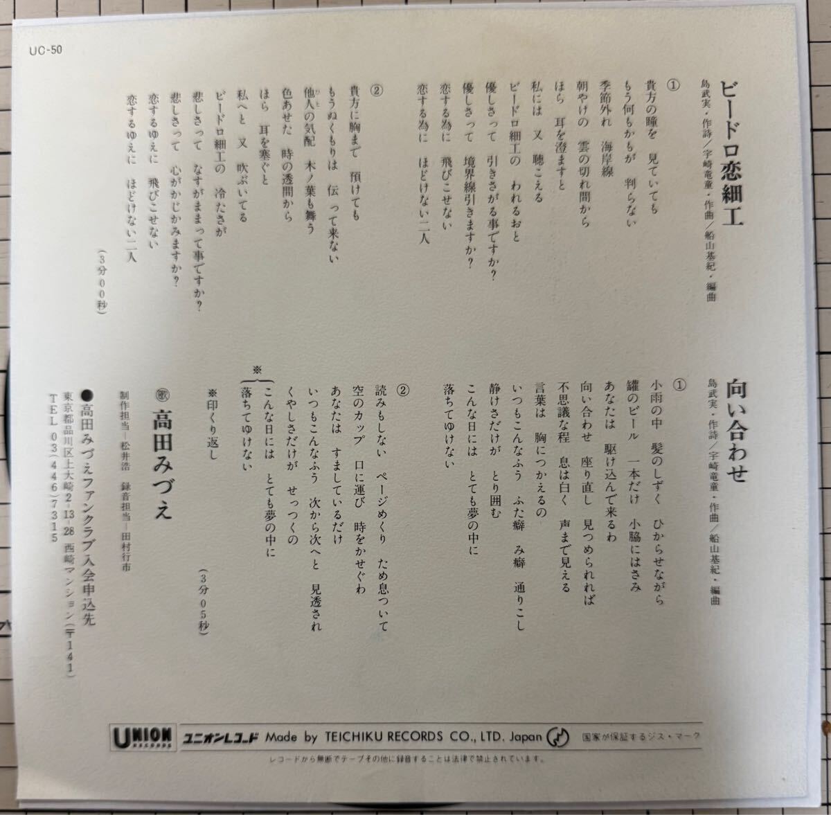 Product name: 即決◆高田みづえ/ビードロ恋細工/向い合わせ (美盤EP) 宇崎竜童