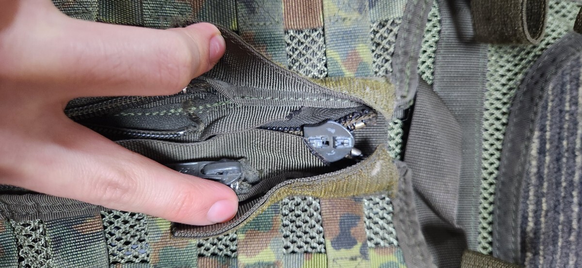 最後の写真の通り、前面チャックのジッパータブが紛失しておりますが閉めれないことはないです。