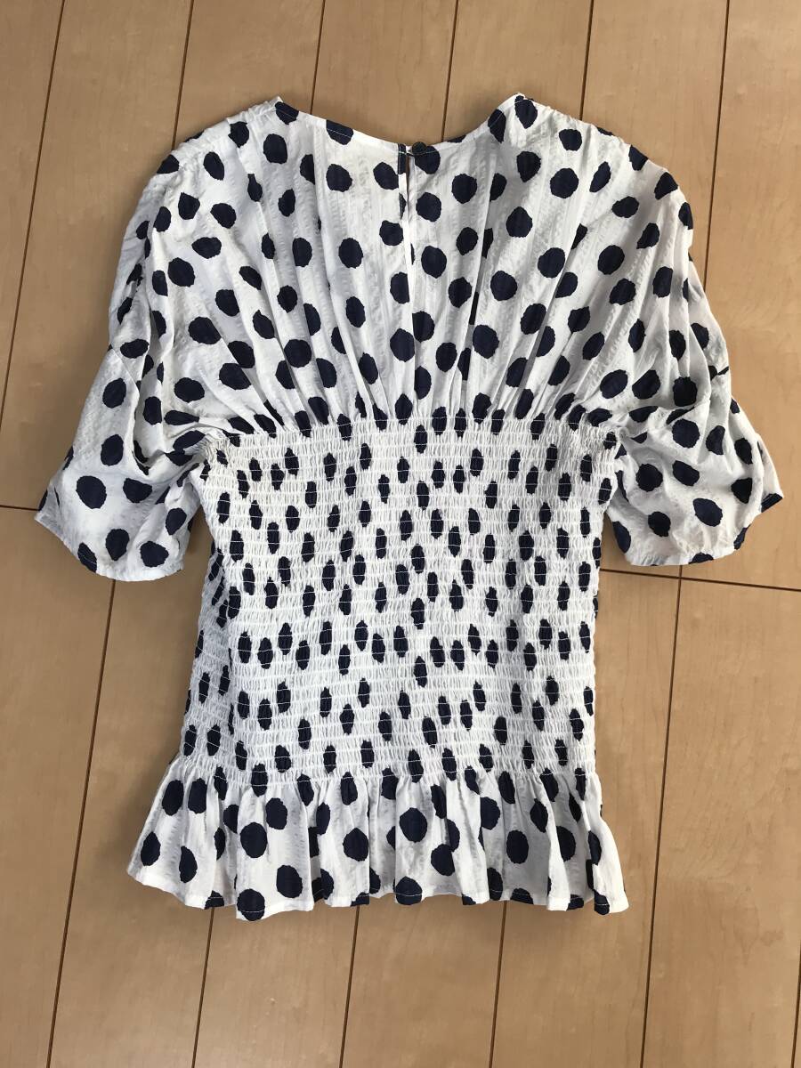 シャーリングでウエストがキュッと見えるブラウスです。デニム合わせがとても可愛いです。少し歪なドットがポイントです。
