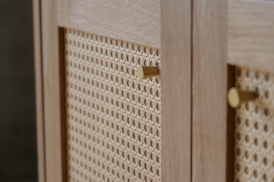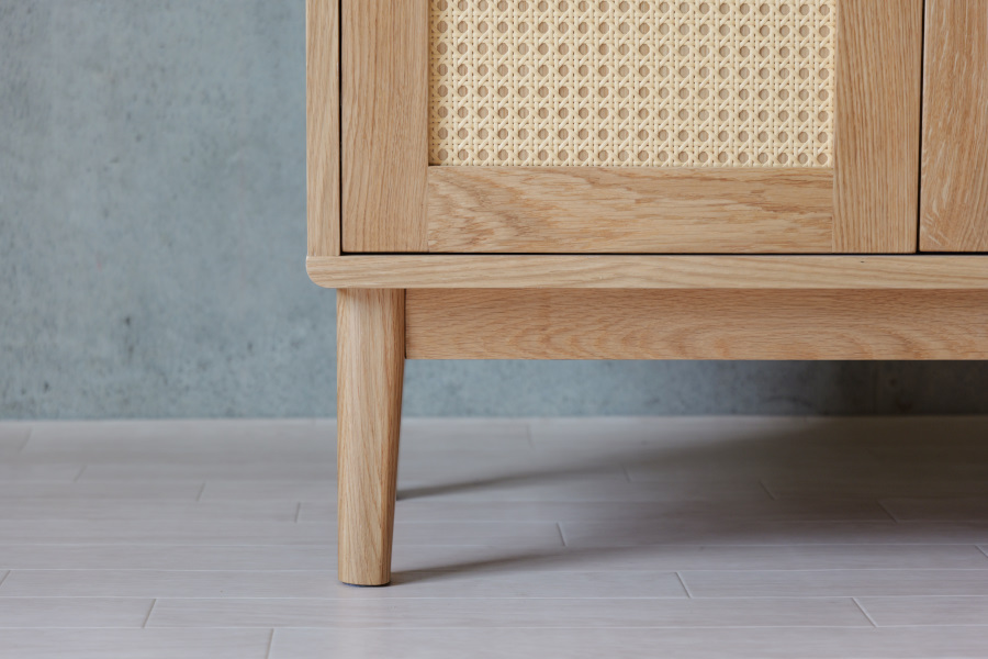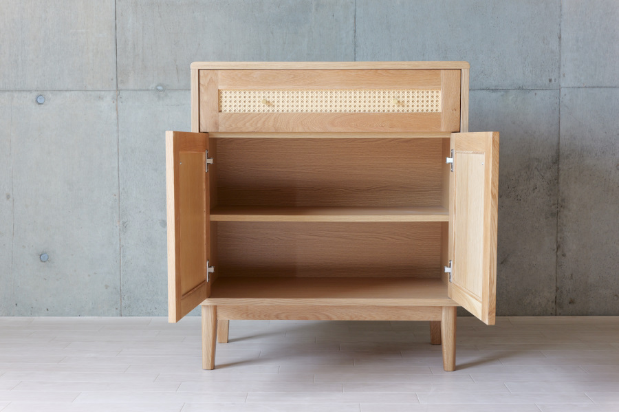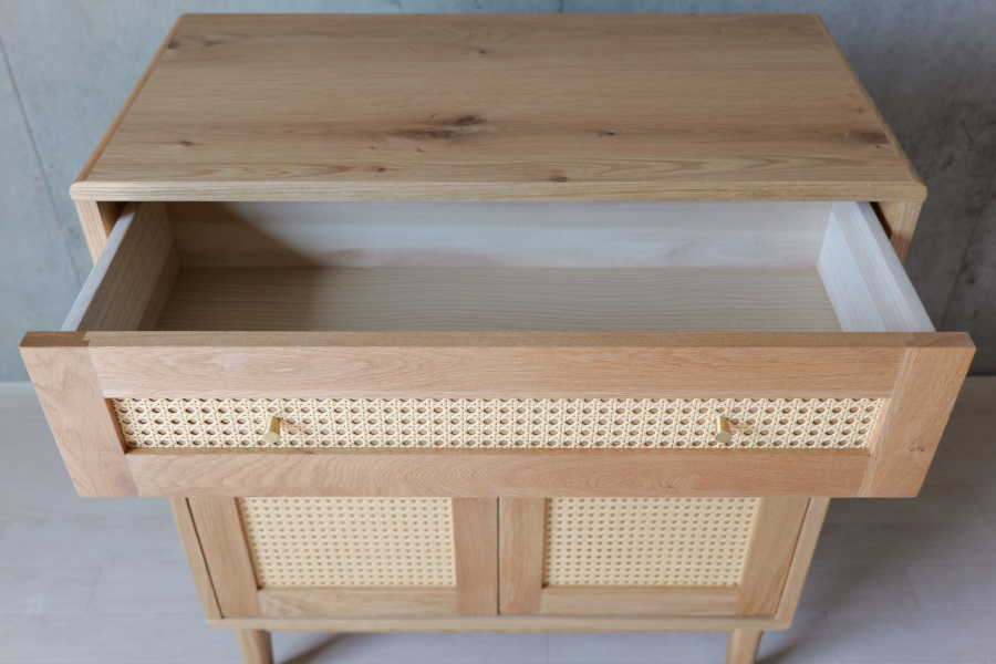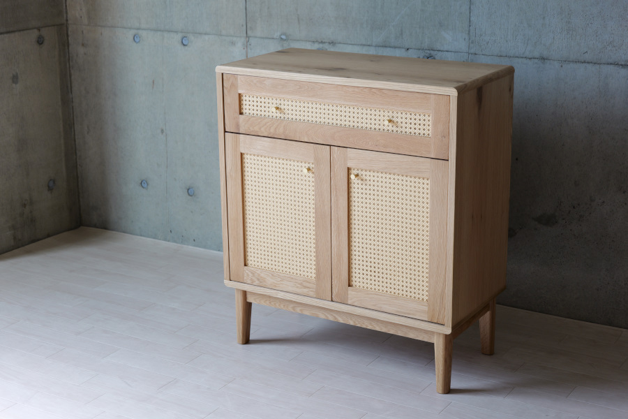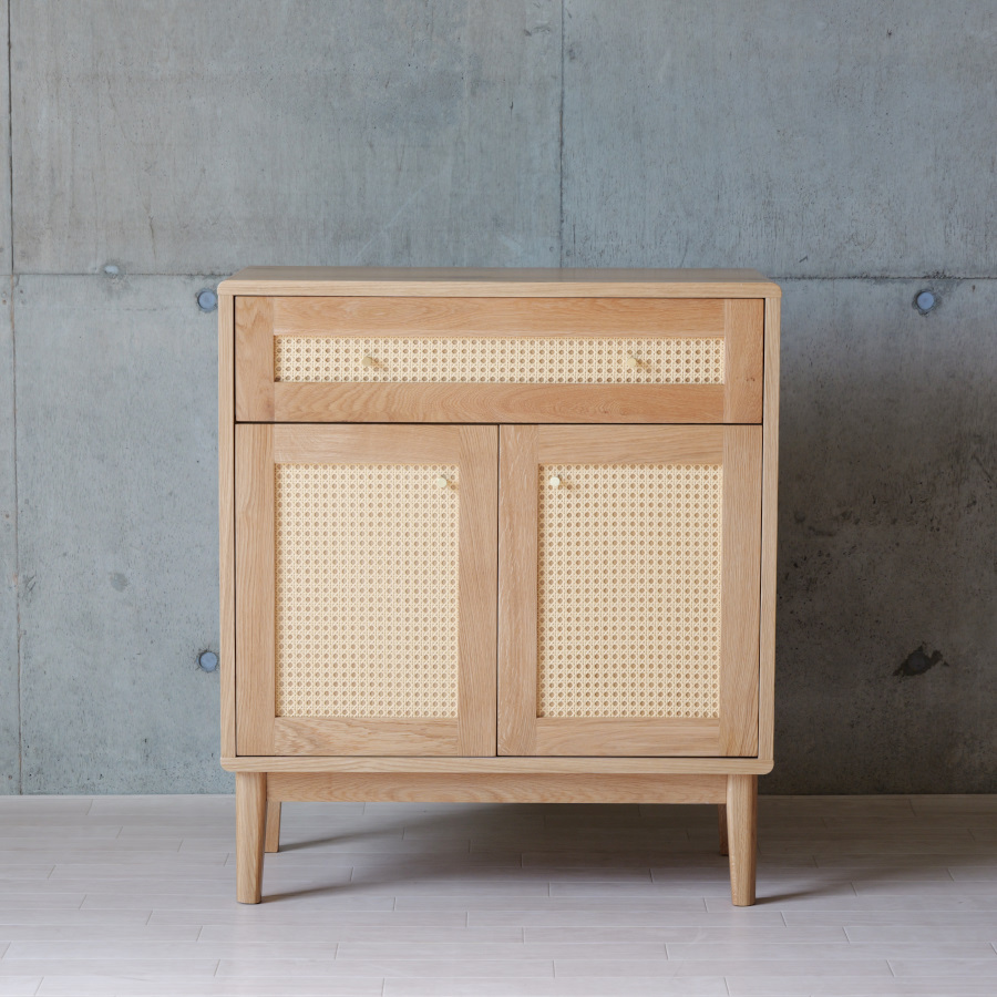 シンプルな要素ですっきりとしたデザインでありながら、引出の前面にはかごめ編みのラタンと真鍮の取手を取り入れ、お部屋に上品なアクセントをもたらし、インテリアとしても存在感を放つアイテムです。