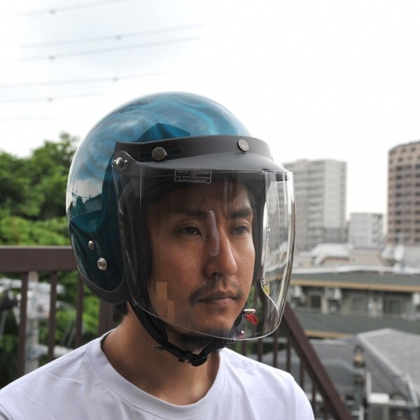 ・ショートバイザーにフラットロングシールドを装着しビンテージなルックス.  日差しを遮るのにも役立つバイザー+風の巻き込みを極力抑え静粛性にも優れたロングバイザーは 機能的にも好評で根強い人気