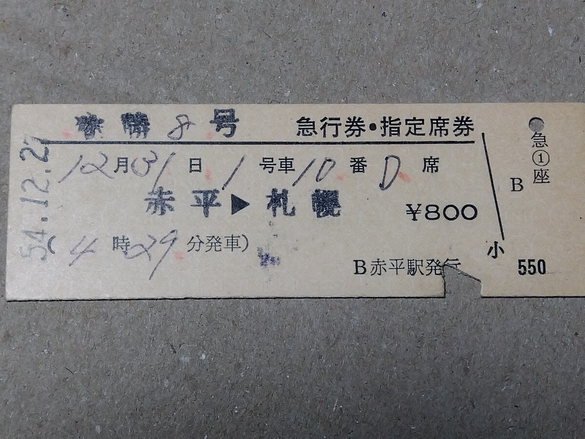 250315-157【国鉄きっぷ】D型硬券 赤平→札幌 狩勝8号急行券・指定席券 昭和54年