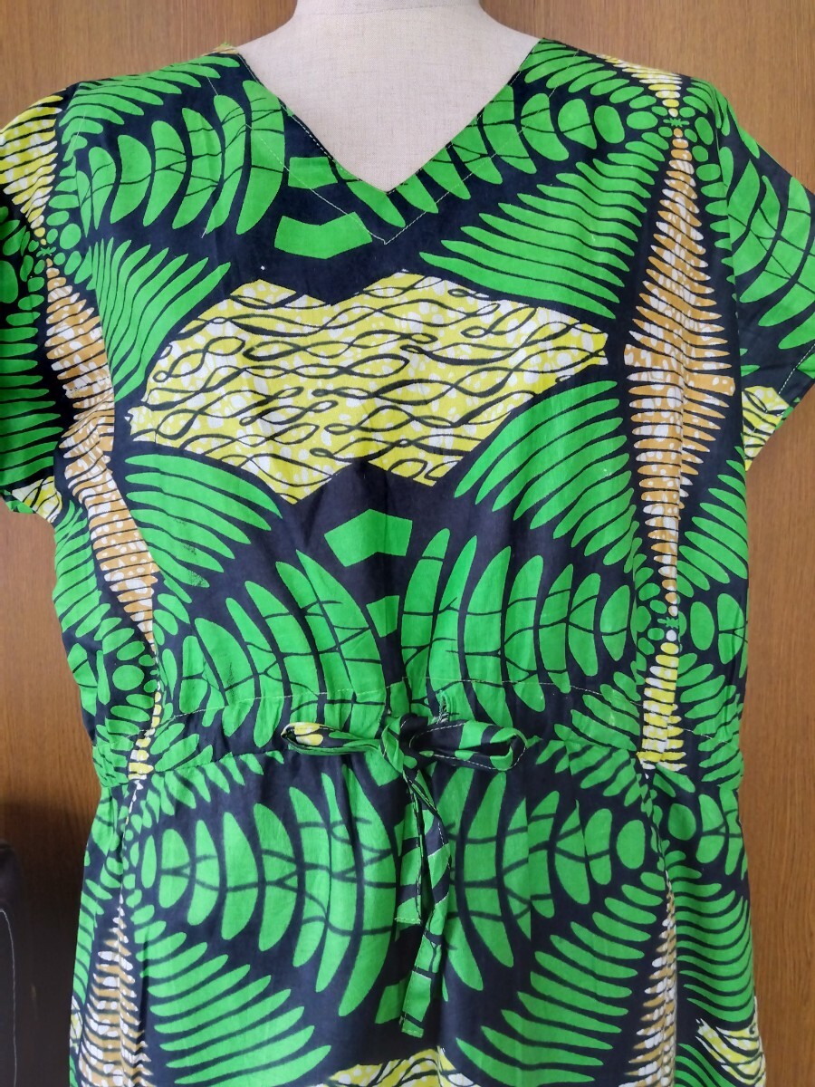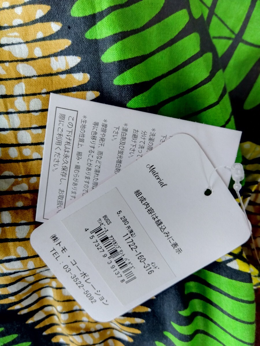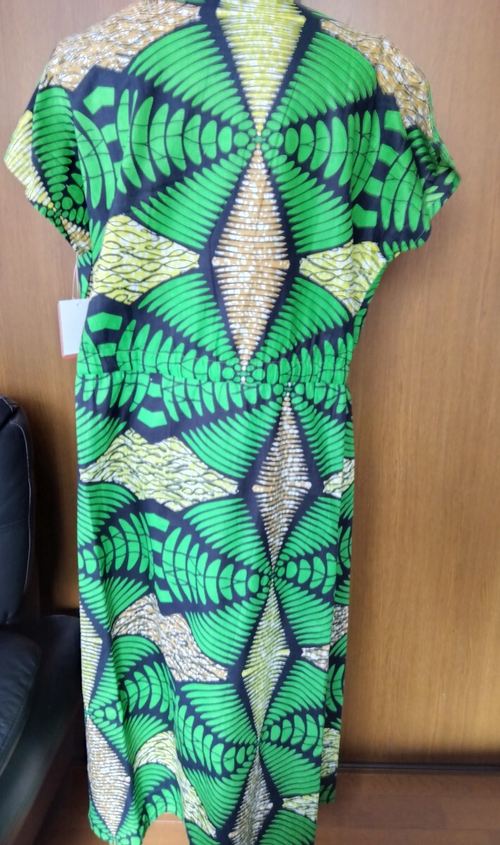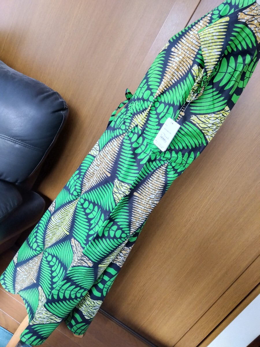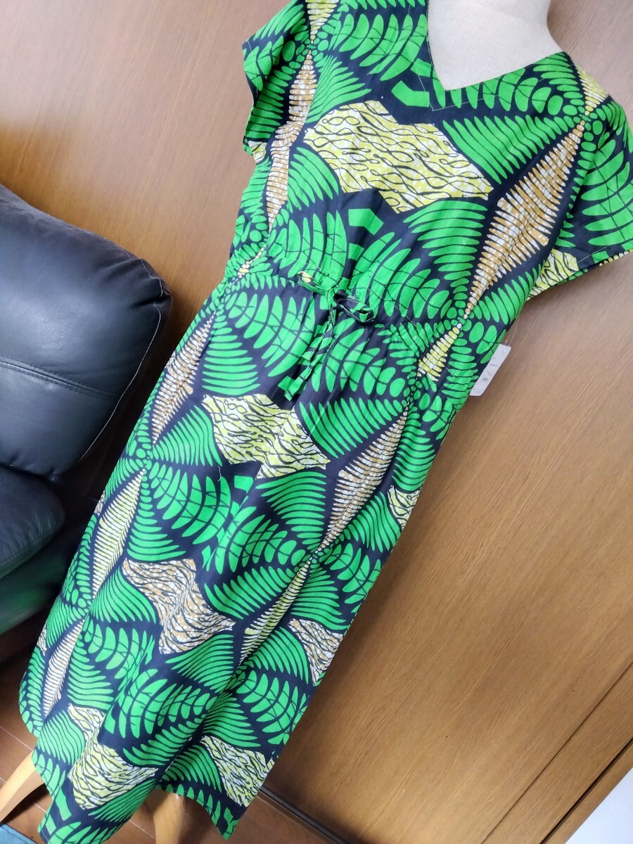 鮮やかなグリーンはじめ、カラフルな色合いで、アフリカンテイストな模様。