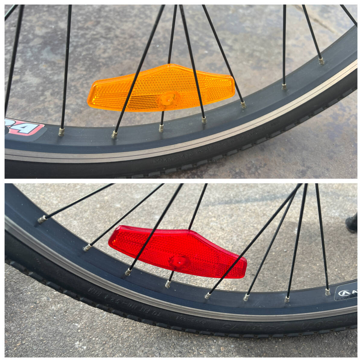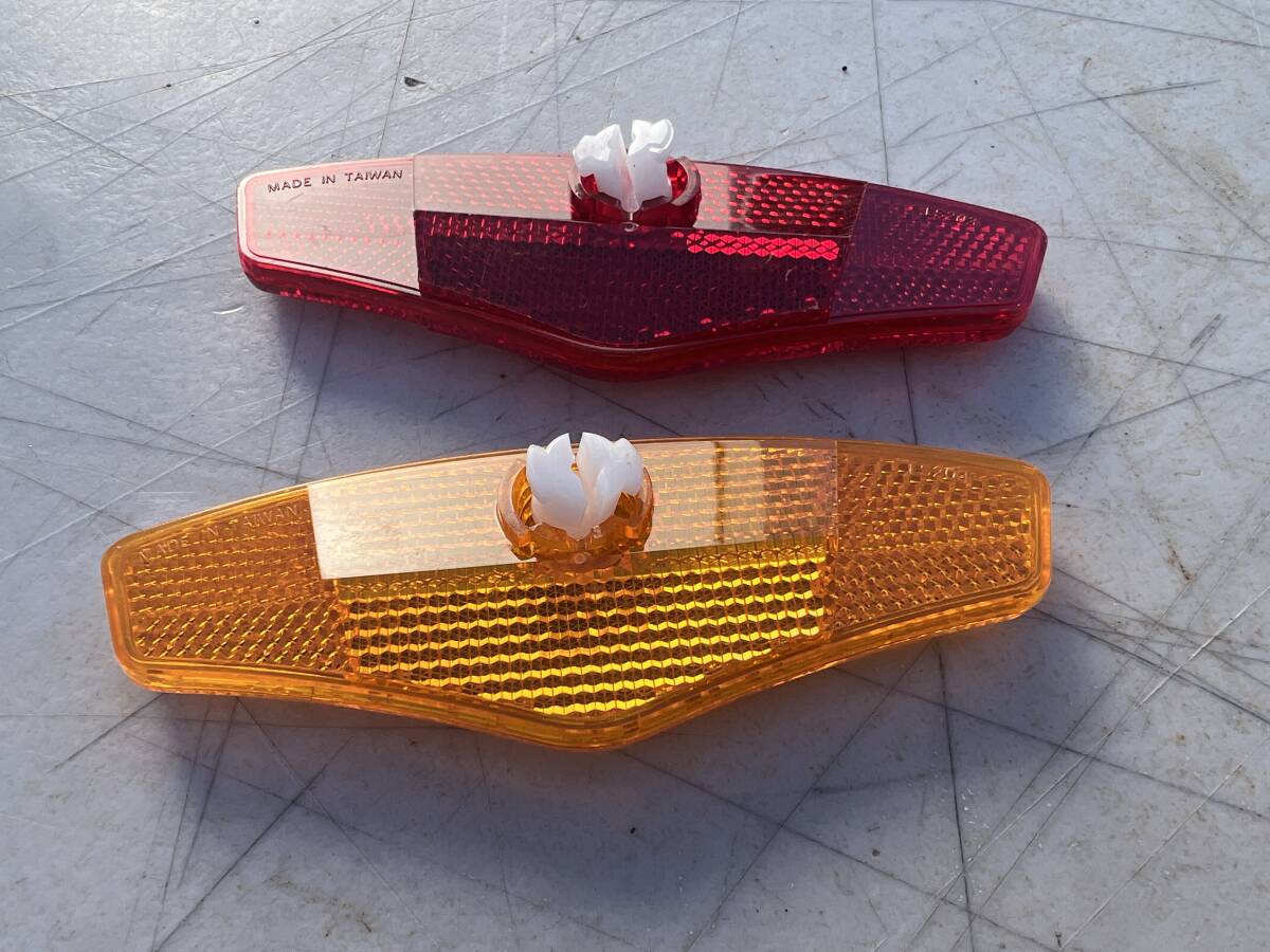 ご覧の商品はアメリカ SUNLITE short wheel Reflector SET Amber/Red Spoke Mounted(スポーク用反射板 オレンジ/ SET)になります