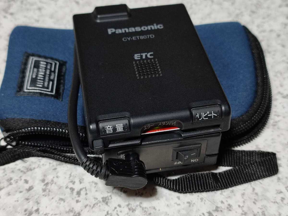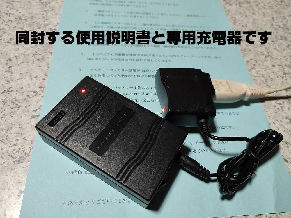 軽自動車でセットアップされた、パナソニック製一体型ETC車載機 (CY-ET807D) を大容量12vリチウムイオン充電池で使用できるよう加工し、 充電池・ 充電器と ポーチに 使用説明書 をセットにした商品です。