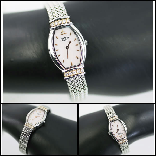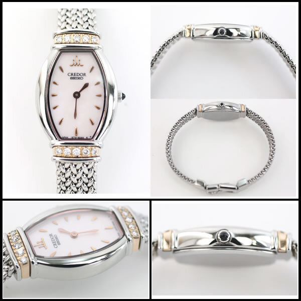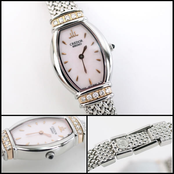 その他商品説明 フランス語で「黄金の頂き」を意味するセイコーのクレドールから、シルバーボディにピンクシェルダイヤルが大変美しい「クレドール シグノ」をご紹介します。当商品は世界に誇る国産時計メーカーであるセイコーの最高峰モデルであり、人気のトノー型ケースにきめ細かいメッシュデザインのブレスレットが絶妙にマッチしたモデルです。さらに、K18素材を使用した上下のラグ部分には上質なダイヤを5石ずつセットしており、より一層の高級感を演出しています。どんなファッションとも相性が良く、フォーマルからカジュアルまで幅広くマッチします。この機会に是非ご検討下さい。